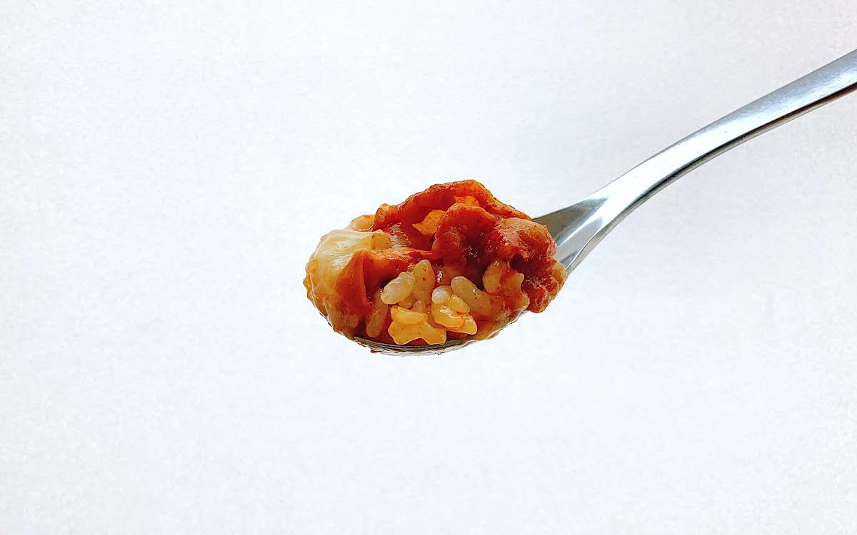 さっそくレンジで加熱調理(目安時間500Wで3分30秒)をおこない、蓋を開けるとコチュジャンの刺激的な香りとにんにくの食欲をそそる香りがふわり。タッカルビは中皿にのせられており、その下にご飯が隠れていました。パッケージの表示通りに手前の出っ張り部分を持ち、注ぎ口からタッカルビをご飯の上にのせれば完成です。