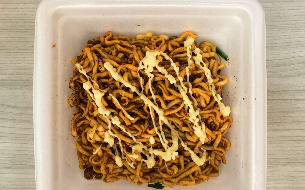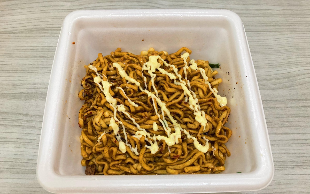 4分経ったらお湯を捨てて液体ソースを混ぜると、クリーム色の麺がみるみるこってりした醤油色に。これだけでも十分美味しそうですが、さらにふりかけとマヨネーズをかけて混ぜれば完成です。