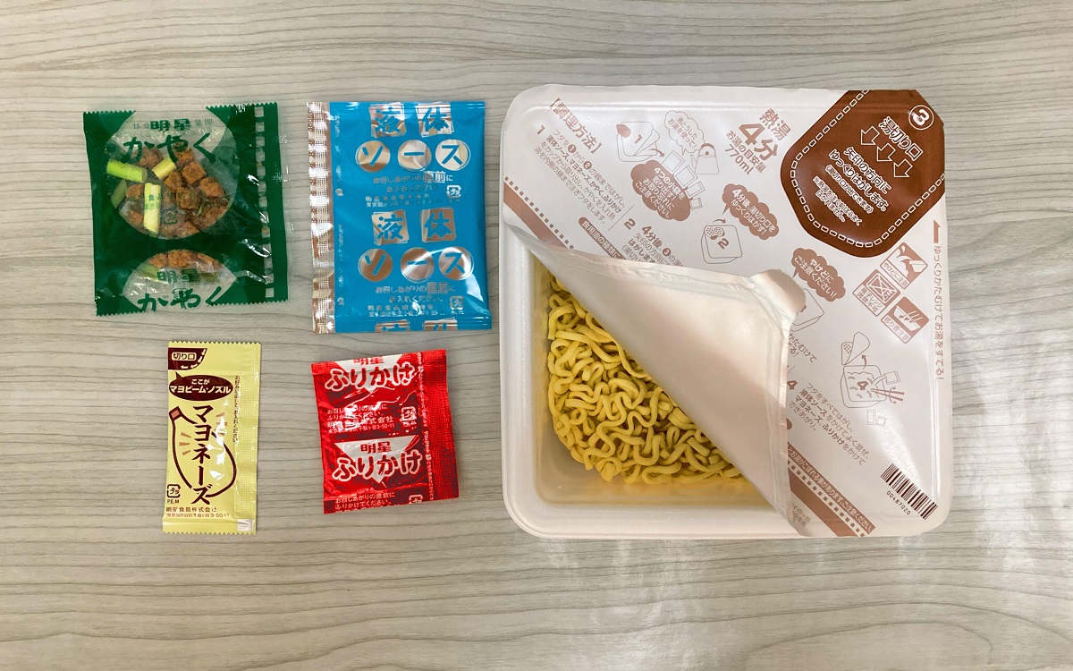 パッケージに同封されていたのは、かやく・液体ソース・マヨネーズ・ふりかけの4袋。まずはかやくのみを容器に入れ、お湯をかけて4分待ちます。お湯をかけた時点で既にかやくのニラと豚肉のいい香りが漂ってきました。