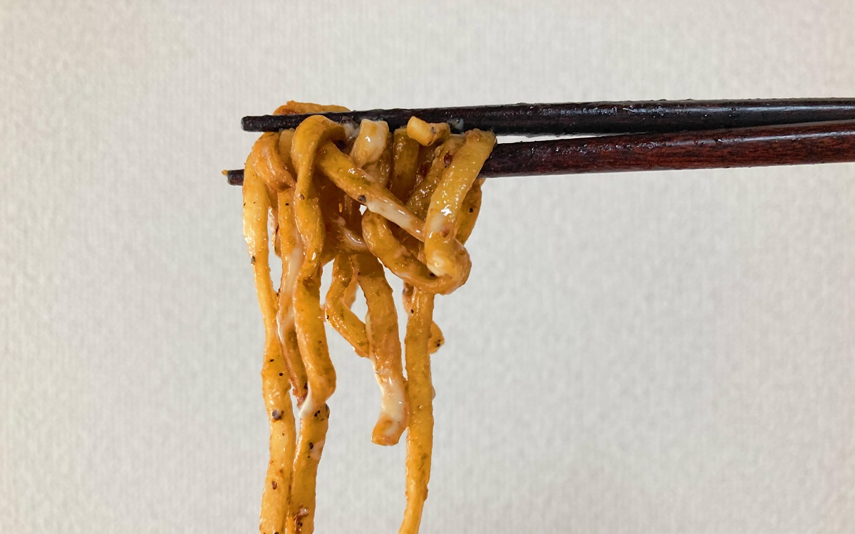 早速一口食べてみると、マヨネーズの酸味とニンニクがきいた濃厚な醤油ダレの旨みが口いっぱいに広がります。厚く平たい極太の麺は歯応えがよく、本家のワシワシとした食感を再現。付属のふりかけもスパイスが効いていて、求めていたこってり感を堪能できました。