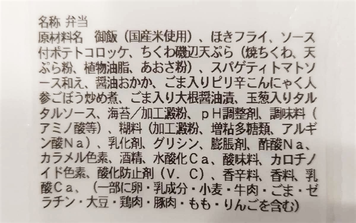 まずはレンジで加熱調理(500Wで2分)をおこない、具材やたっぷり盛りつけられたご飯をホカホカな状態に。フタを開けると、定番の具材たちが並んでいます。具材は白身フライ・ソース付ポテトコロッケ・ちくわ磯辺天ぷら・トマトスパゲティ・ごま入りピリ辛こんにゃく人参ごぼう炒め煮・ごま入り大根醤油漬・醤油おかかのせご飯です。