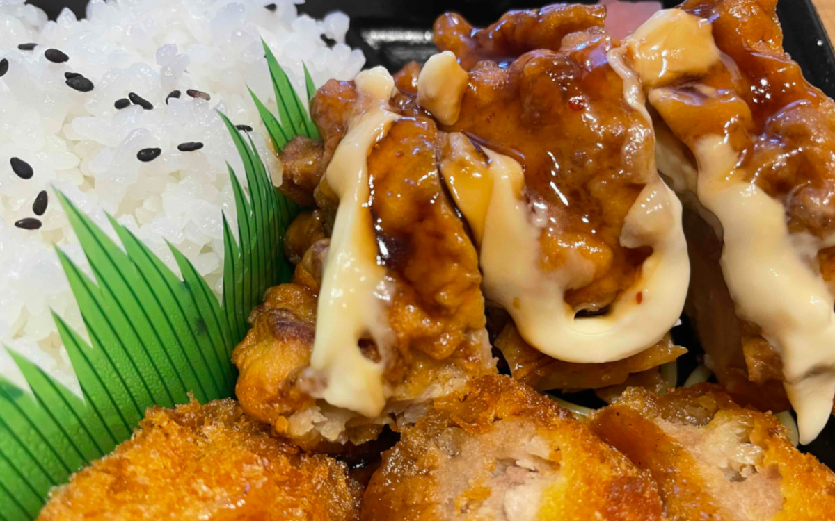 唐揚げには甘辛いソースとマヨネーズをトッピング。よくみると一味のような赤い粉がかかっているように見えますが、唐辛子のような辛みは感じられないため辛さが苦手な人でも問題はありません。