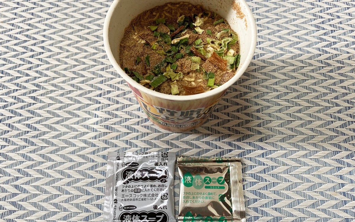 お湯を注いだら、後入れの液体スープ2種をフタの上にのせて3分。液体スープを入れると、ガーリックとジンジャーの良い香りが漂ってきます。これは食欲がそそられますね。