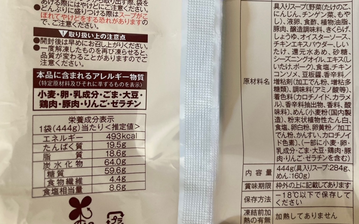 麺は160gで具入りスープが284g。スープの存在感が圧倒的だということは容量でもわかりますね。だからといって麺が少ない印象はありません。個人的には普通のラーメンよりも食べ応えがあって、満腹感を感じられました。