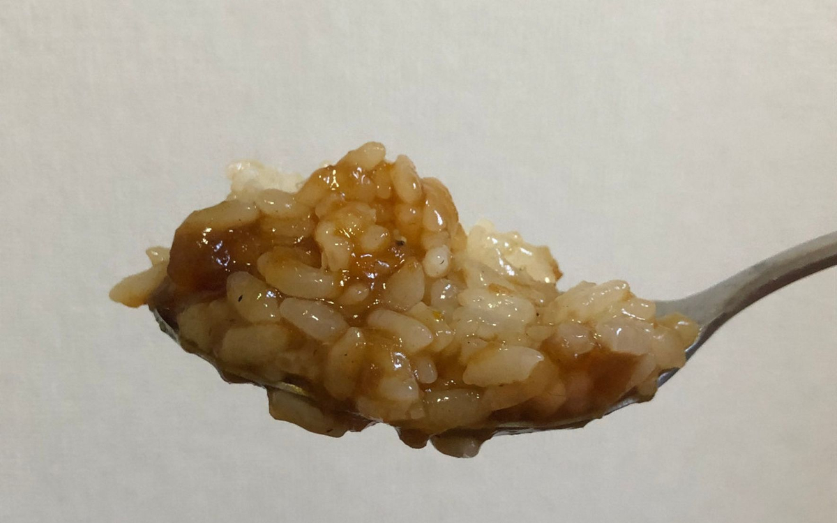 次はご飯と一緒に食べてみます。粒立ちしたもちもちのお米は、ソースに浸っても1粒1粒がしっかりしており、主役に負けないほど存在感たっぷり。醤油ベースのオニオンソースとご飯が非常にマッチして、みるみる容器から消えていきます。ソースの量も十分で、最後までしっかり味の絡んだご飯を堪能できました。
