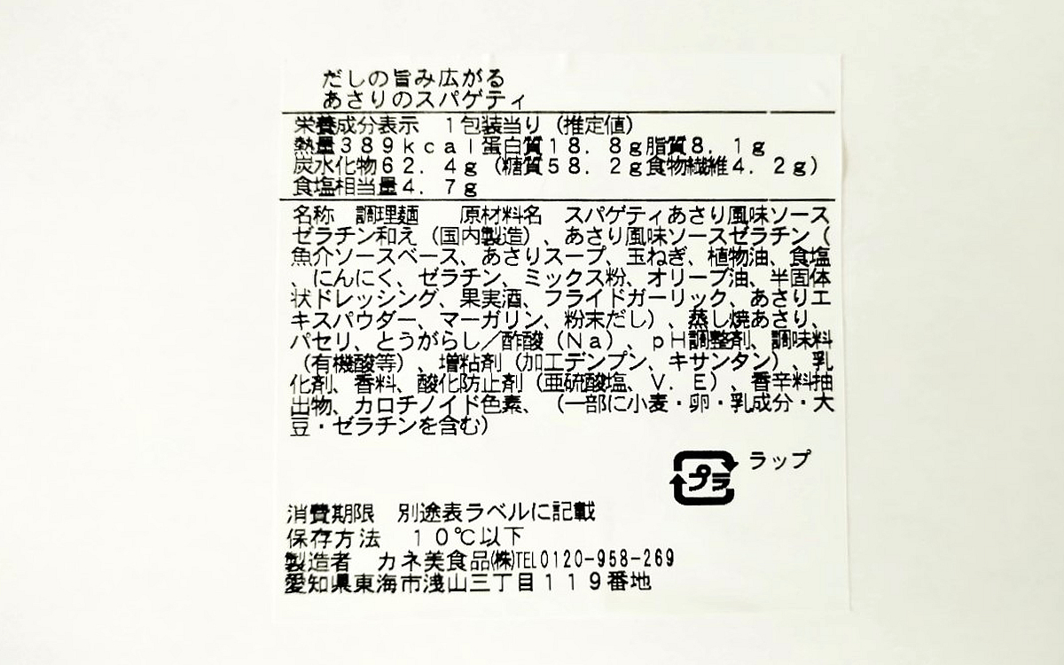 同商品の味付けは、あさりや昆布のだしに玉ねぎやにんにくなどを合わせたソース仕立てです。にんにくとオイルのあさりスパゲティはよく見かけますが、あさりと昆布のだしの旨みで仕上げたスパゲティは珍しく味わいが気になるところ。また、あさりもふっくらと蒸し焼きにしてあるとのことで身の食感が楽しみですね。