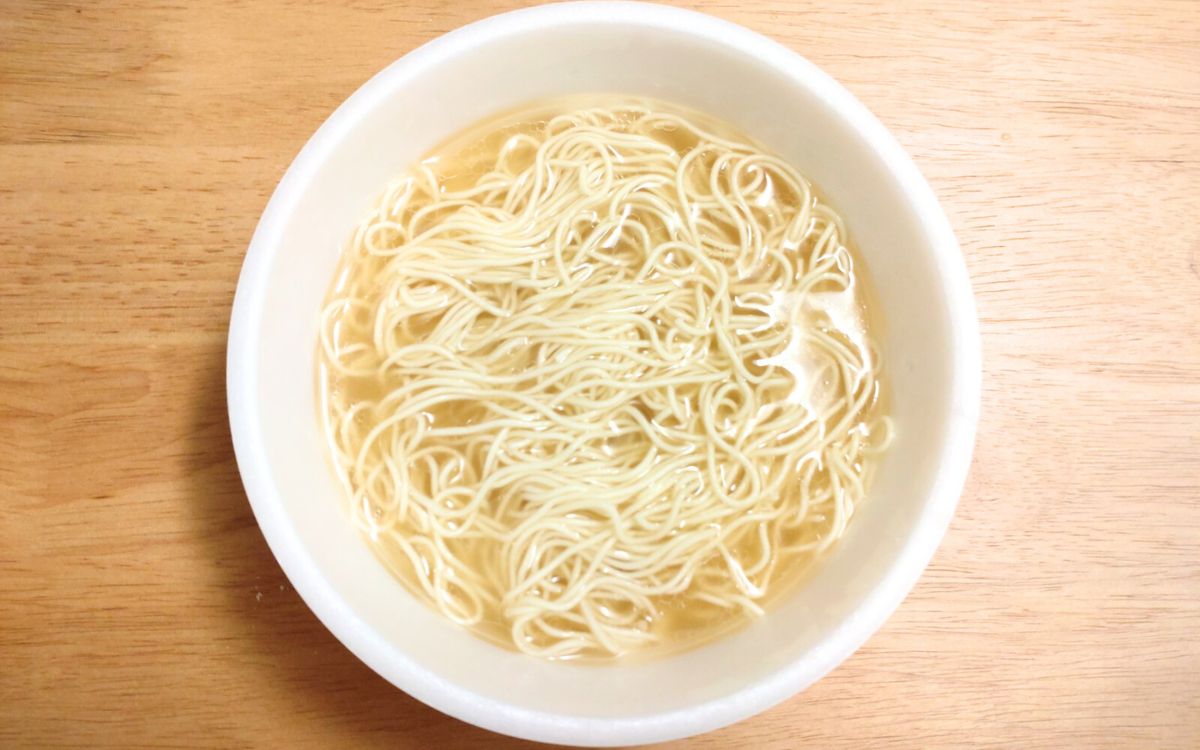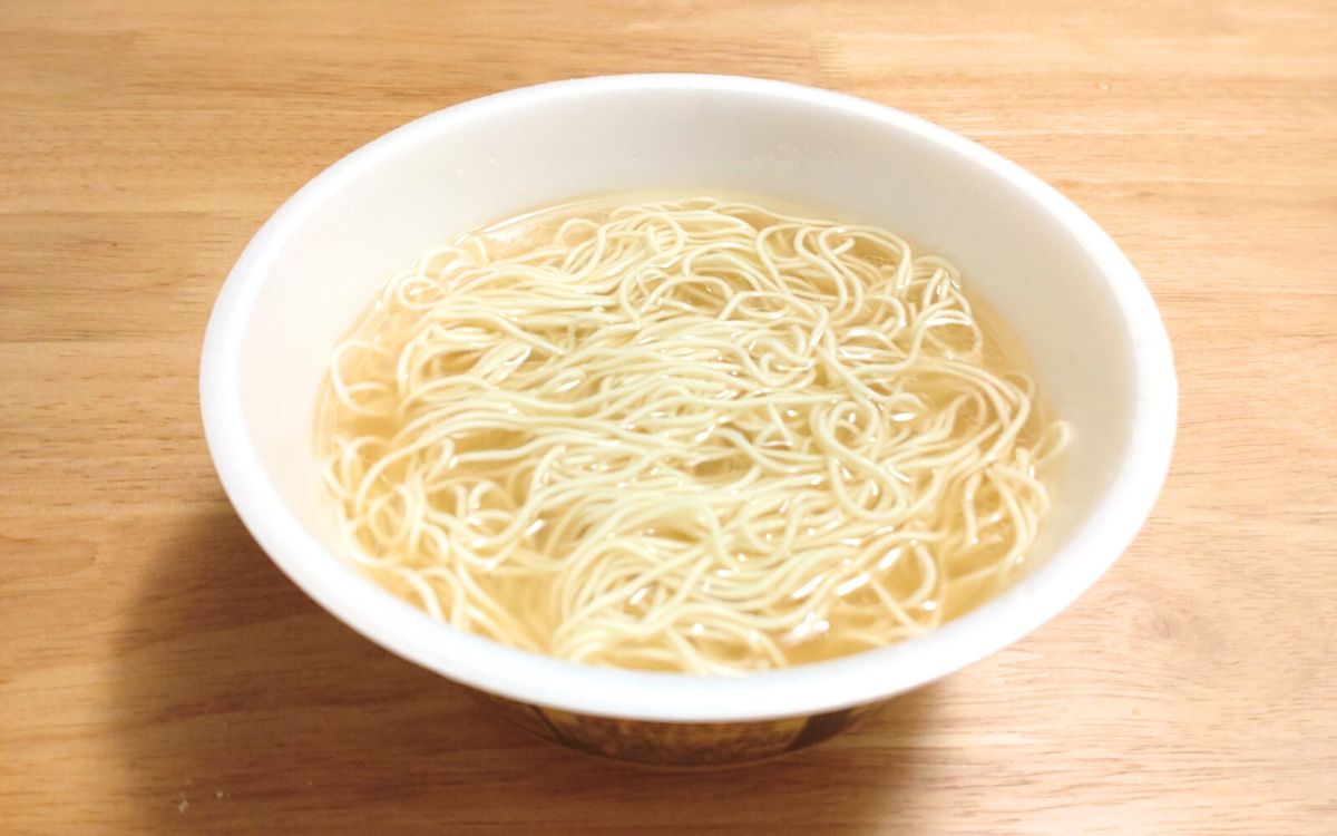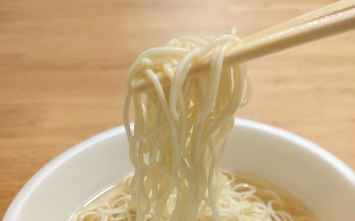 スープは、商品名にもあるように透明の豚骨スープ。一般的に豚骨といえば白濁したスープのイメージですが、同商品は本当に豚骨なのか疑わしくなるほど透き通ったスープです。においを嗅いでみましたが、豚骨特有のクセの強い匂いはなく、醤油ラーメンのようなさっぱりとした香りが感じられました。