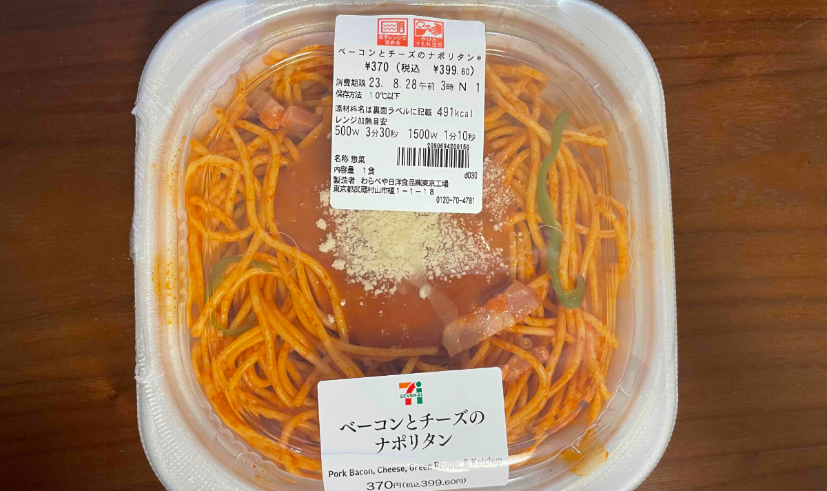 同商品はセブン-イレブンから販売されているナポリタンのひとつ。セブン-イレブンでは、チルドパスタから冷凍パスタまでさまざまな種類のナポリタンを取り扱っています。その中でも今回は、パスタでは定番ともいえるベーコンとチーズをトッピングした「ベーコンとチーズのナポリタン」(399円/税込)をセレクト。どのようなナポリタンになっているのでしょうか。