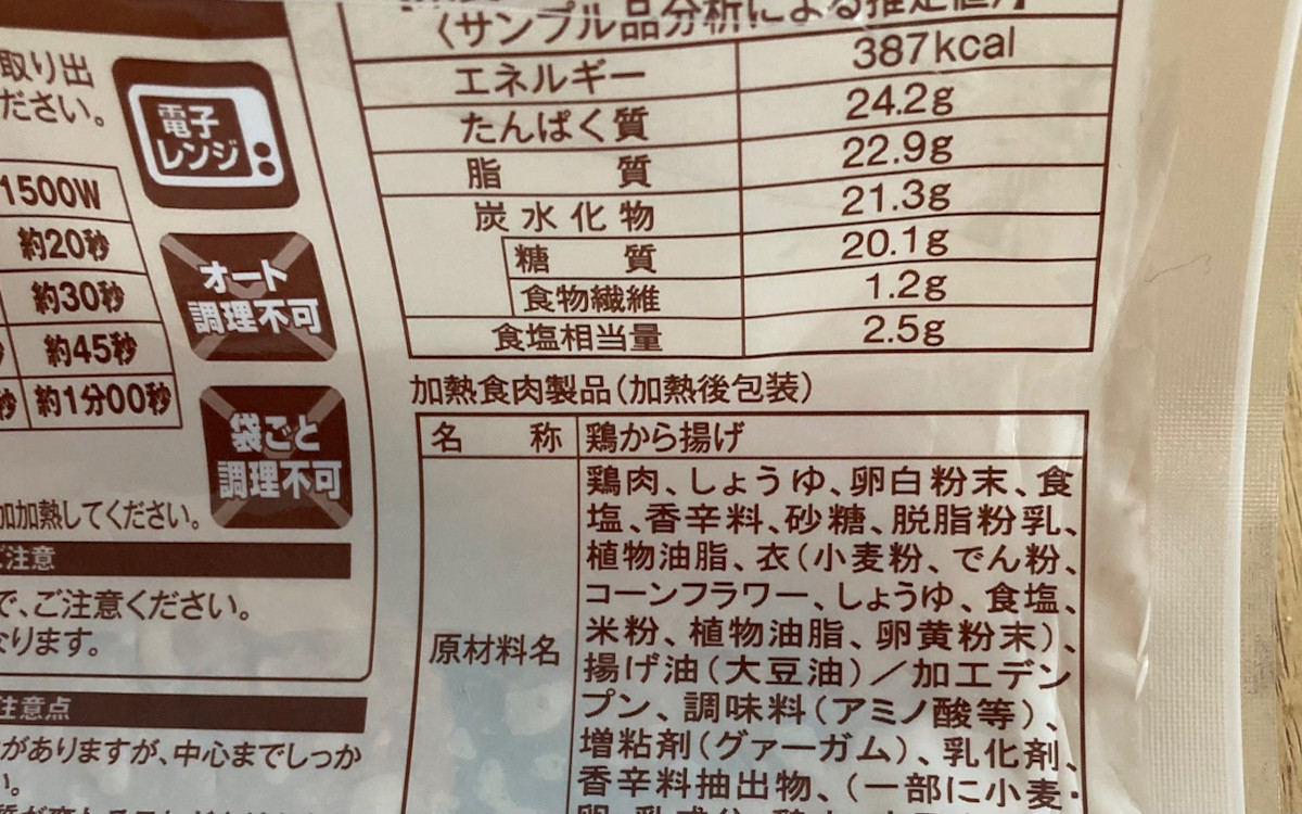 衣がサックリとしているのは、小麦粉のほかに米粉もブレンドしているからでしょうか? 鶏肉の旨味の秘密は原材料を見てもイマイチ解明できませんでした…。旨味は強いですが全体的にあっさりしているので、マヨネーズなどを合わせても美味しいかも。