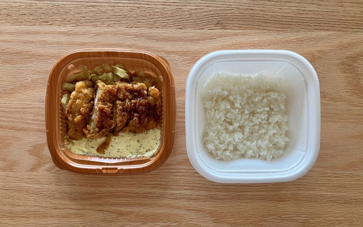 表示通り500Wで3分30秒加熱した後、蓋を開けるとさっそくカレーのスパイシーな香辛料の香りがふんわり漂ってきました。同時にタルタルソースとウスターソースの食欲を刺激する香りも相まってたまりません。容器は2段になっており、おかずとご飯が分かれていて水っぽくならない工夫がされています。