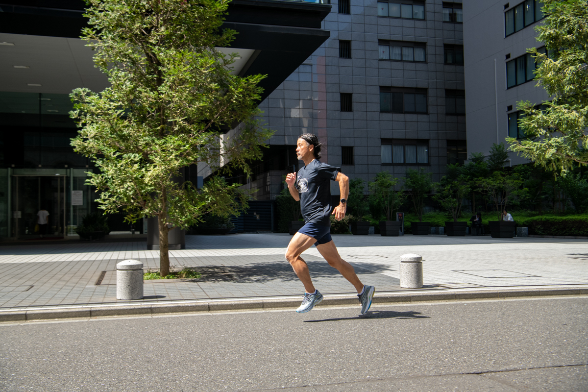 まずは、シューズに足を入れた感覚およびウォーキングのインプレから。次は「運動不足解消」が目的で走る1㎞を約7分(=キロ7分)の、の~んびり走。続いて、脂肪を燃焼させる「痩せラン」に適した、1kmを約6分(=キロ6分)の、めらめらペース。最後は、距離ではなく、走り切る爽快感を重視した、1㎞約4分30秒~5分(キロ4.5~5分)の「スカッと走」である。