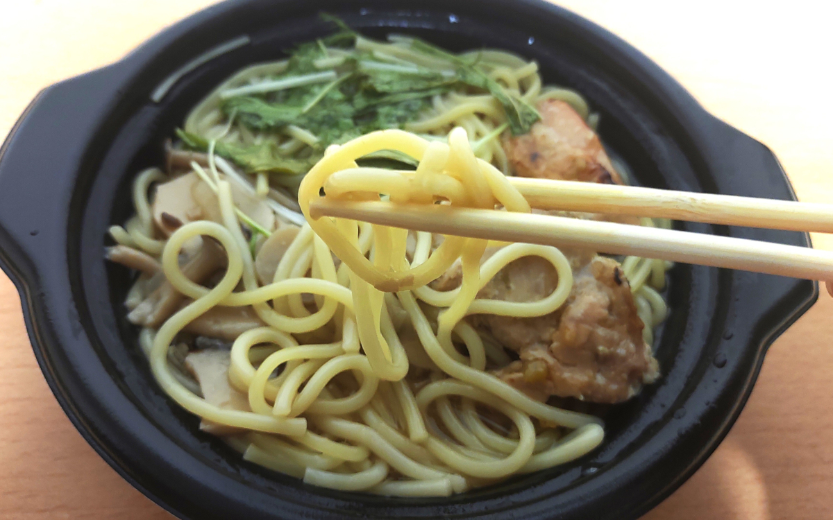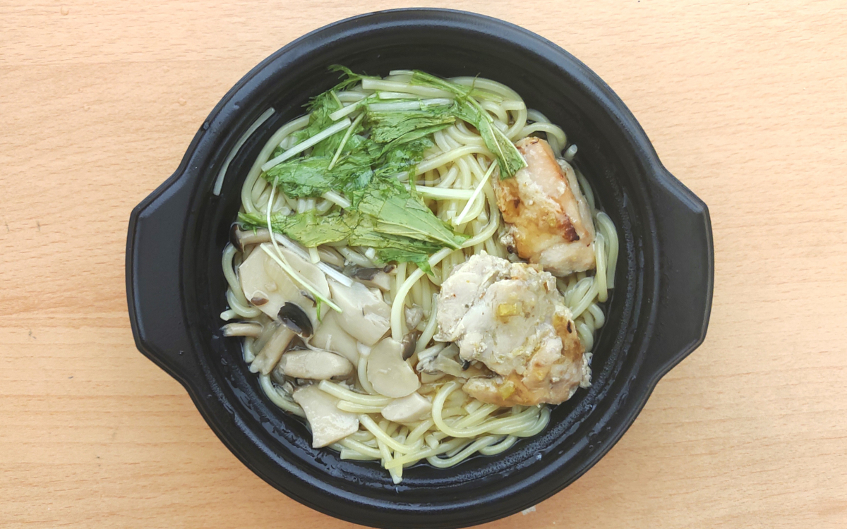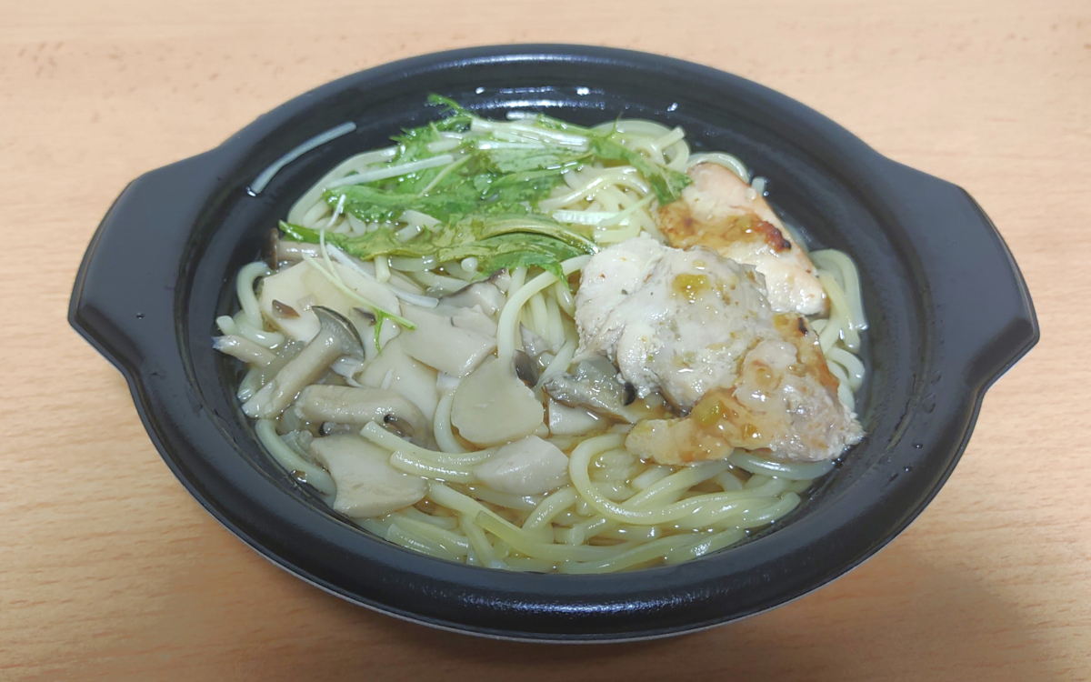 鶏肉ときのこの存在感が目を引く「ホッとな おだしパスタ~鶏の柚子胡椒焼とたっぷりきのこ~」(497円/税込)。きのこはエリンギとぶなしめじが入っているほか、玉ねぎや水菜も入っておりとにかく具材がたっぷりです。