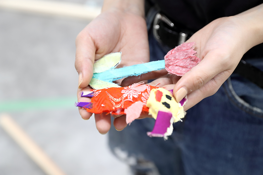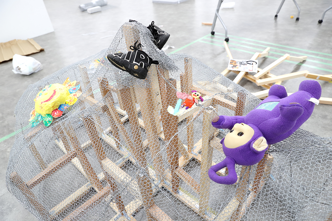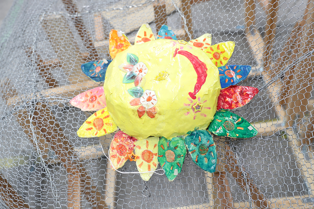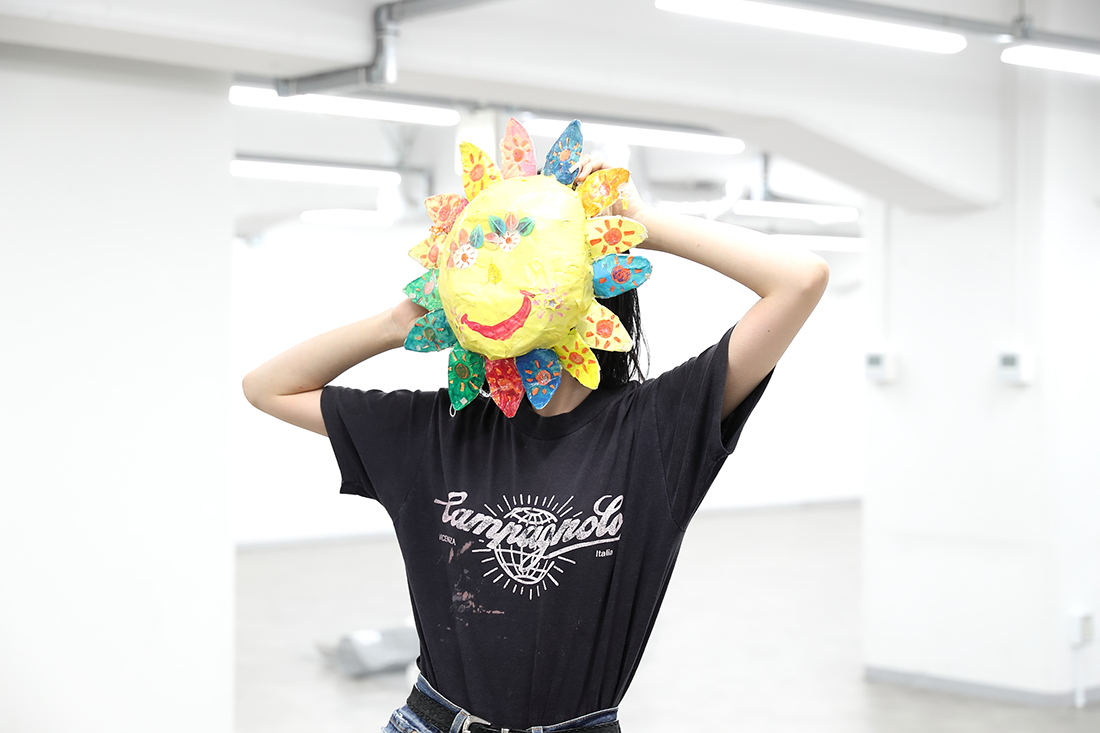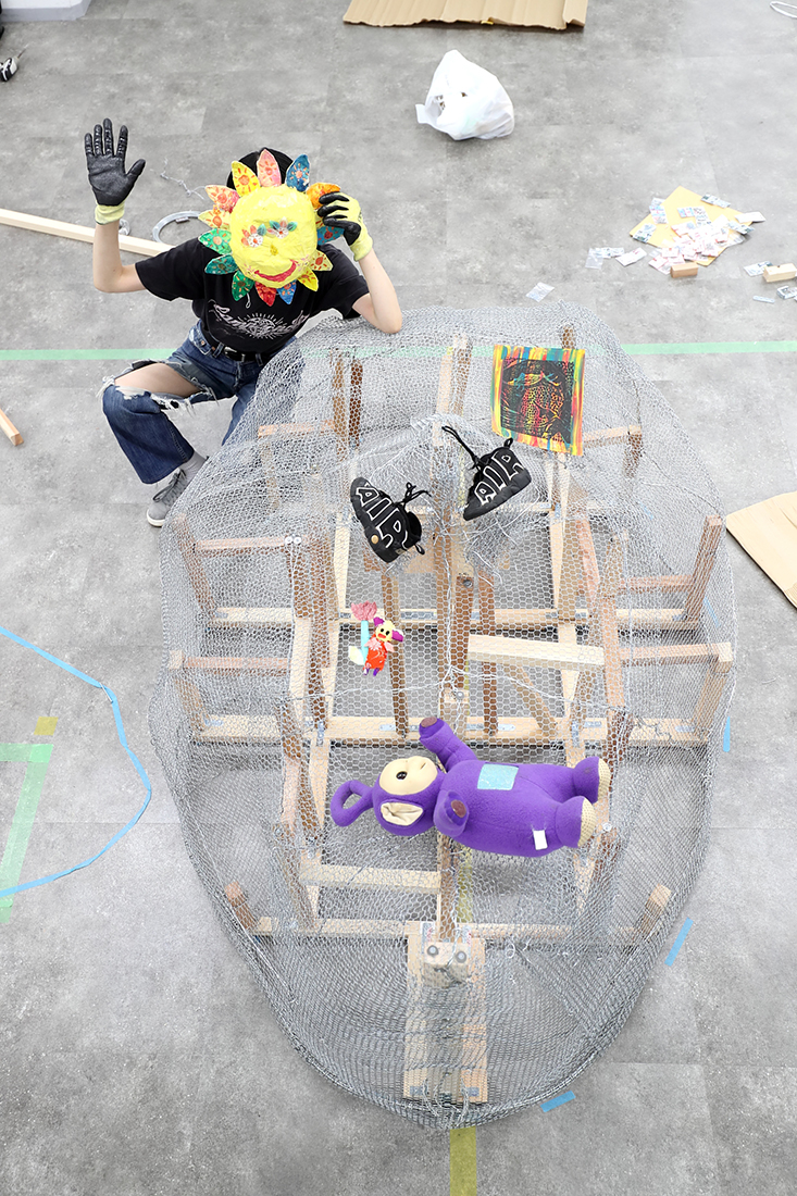 ──現時点で、巨大な顔と両手を、針金で形づくっていて。そこに、太陽のお面やキッズサイズの靴、ぬいぐるみ、衣装などが置いてあります。コンセプトは?