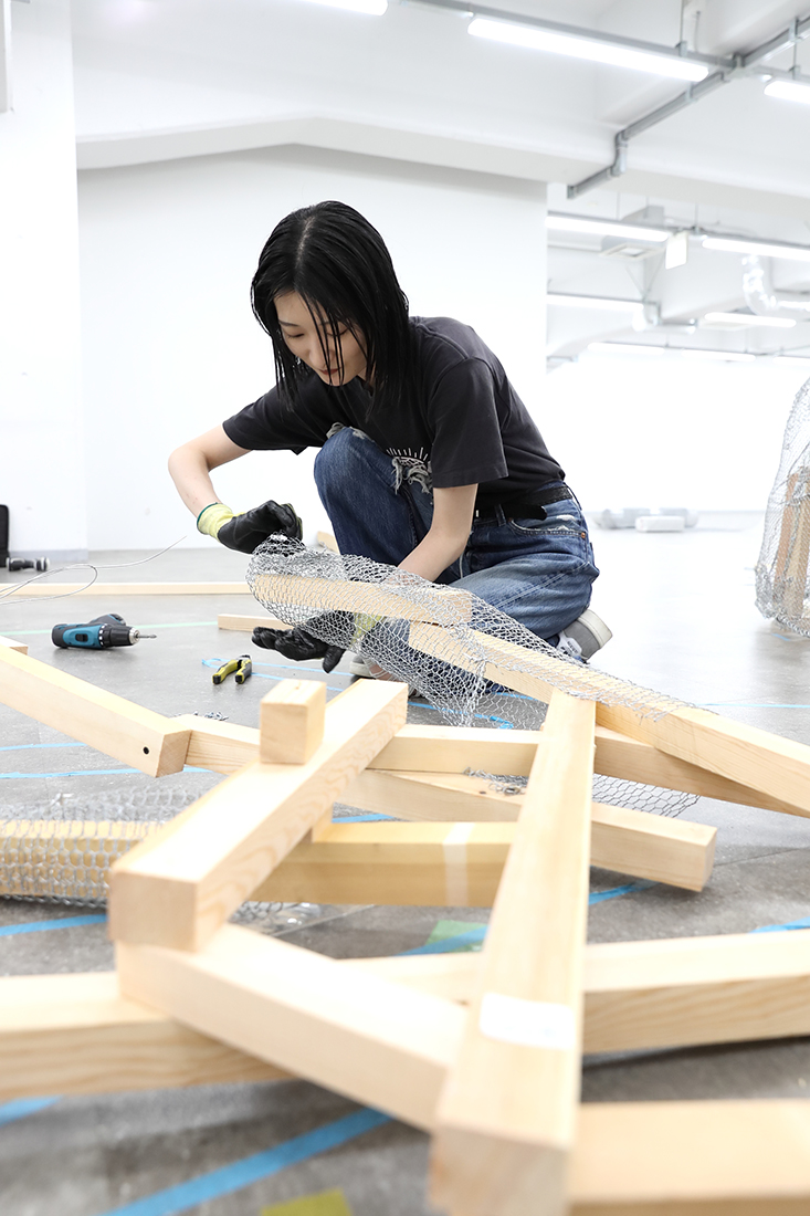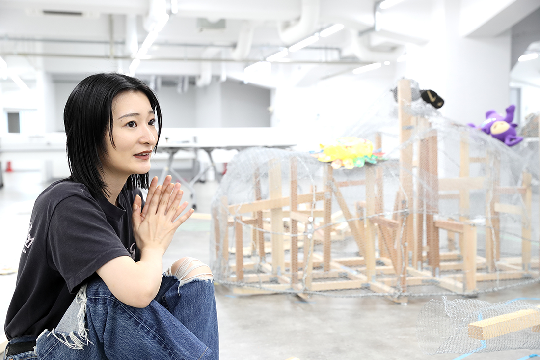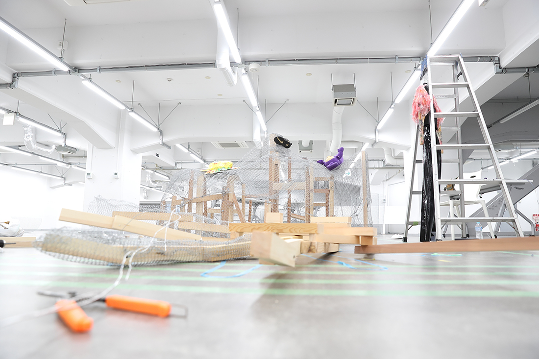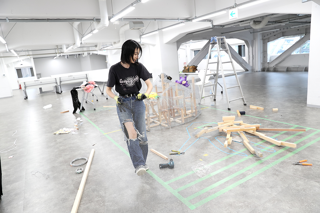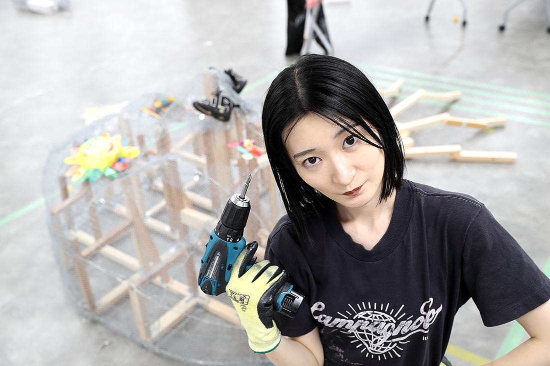 MISATO だから最初から苦労だらけです。この大きな作品を、どんな素材を使って作ったらいいんだろうか、ということも分かっていなくて。まずはいろんな方の作品づくりを見るなかで、今こういう大きな立体物を作るとき、発泡スチロールを使うのが主流だと知って。でも私は、もっと原始的なやり方が知りたいと思ったんです。初めての展示作品だから、いちから手をかけたくて。それで辿り着いたのが、ニキ・ド・サンファルというアーティストでした。製作過程の映像の中で彼女は、硬そうな針金や金網を使っていて、「これだ!」と。とはいえ、設計など分からないので、分かる人をお呼びして、最初の軸となる部分の作り方を教えていただき、あとは基本的に自分でやっています。