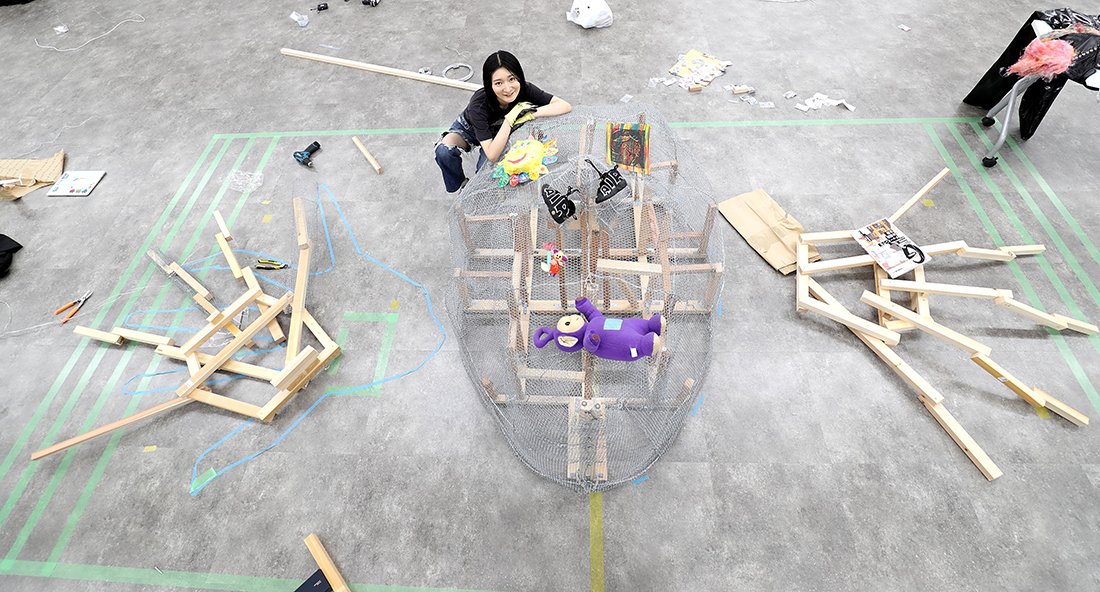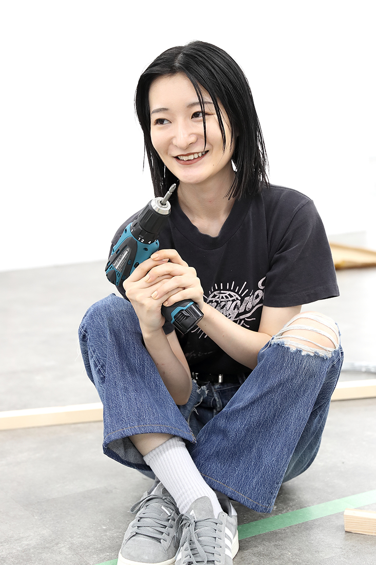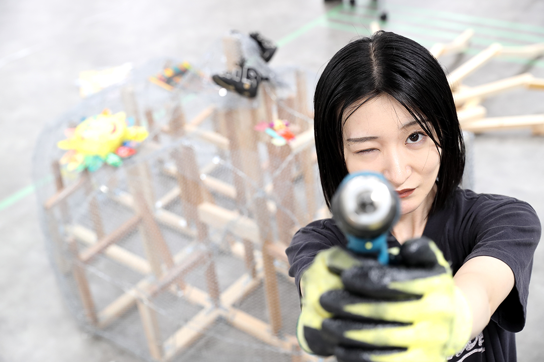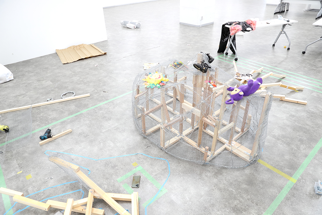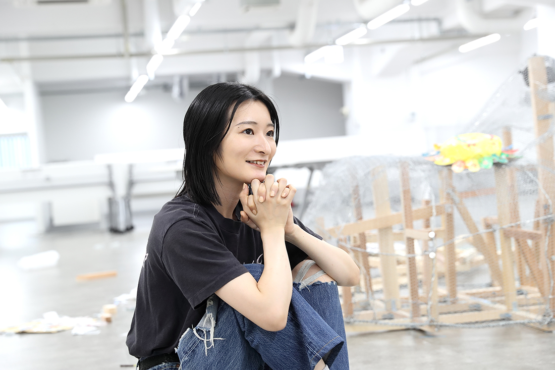 MISATO だから最初から苦労だらけです。この大きな作品を、どんな素材を使って作ったらいいんだろうか、ということも分かっていなくて。まずはいろんな方の作品づくりを見るなかで、今こういう大きな立体物を作るとき、発泡スチロールを使うのが主流だと知って。でも私は、もっと原始的なやり方が知りたいと思ったんです。初めての展示作品だから、いちから手をかけたくて。それで辿り着いたのが、ニキ・ド・サンファルというアーティストでした。製作過程の映像の中で彼女は、硬そうな針金や金網を使っていて、「これだ!」と。とはいえ、設計など分からないので、分かる人をお呼びして、最初の軸となる部分の作り方を教えていただき、あとは基本的に自分でやっています。