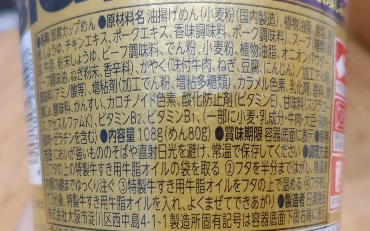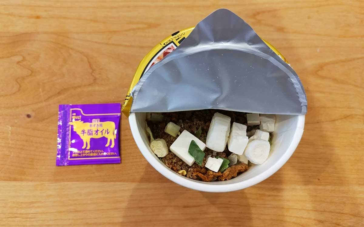 カップ麺に別添付されているのは、特製牛すき用牛脂オイルの1つ。カップの中を覗くと、たくさんのかやく類が入っていました。まずはお湯を注ぎ、牛脂オイルをフタの上で温めて3分待った後にIN。濃口醤油の割り下風スープと混ぜ合わせると、すき焼きの甘い香りが漂ってきました。これは、食欲をそそりますね。