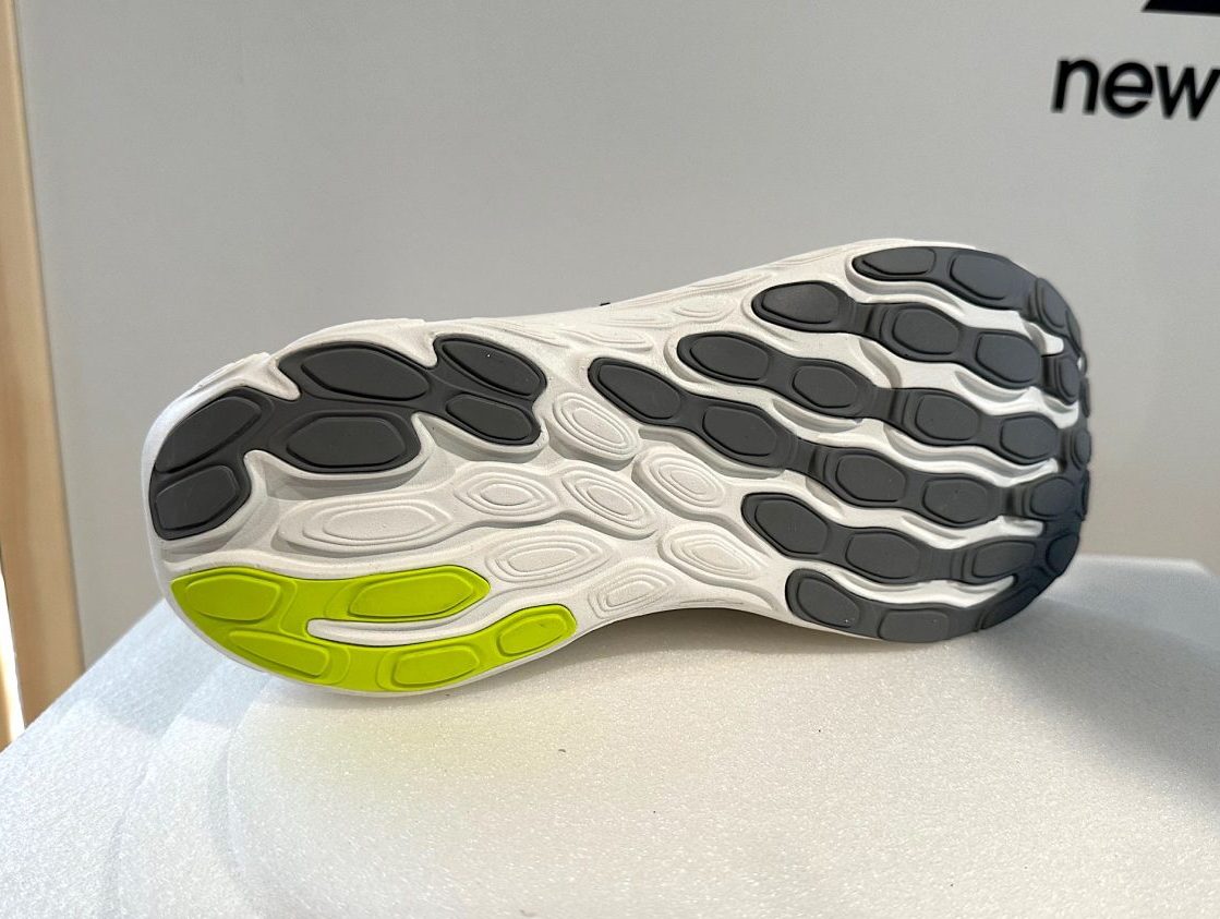 1080の最大の特徴が、凸凹構造のミッドソールです。凹んでいるところは上から荷重を掛けると潰れやすいのでクッショニング効果が得られ、出っ張っているところは潰れにくいので安定感が出るという凹凸構造を組み合わせたワンプレートにすることで劇的な軽量化に繋がっています。