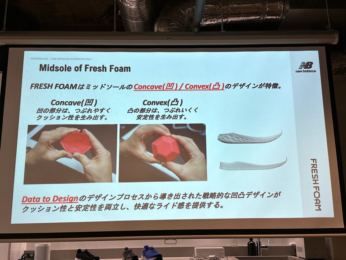 「今までのフットウェアのデザイナーは自分の感性でペンを走らせて絵を書くことが基本でしたが、このFresh Foamに関しては、AIで解析してコンピュータが自動的にデザインを起こしていく。プラス我々の方では実走も行い、体感も含めながら最新のデザインを起こしていきます。100%コンピュータ任せではなく、ハイブリッドの形を採用しています」(武田氏)