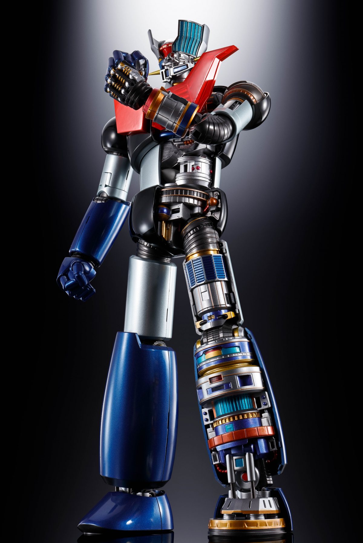 さらに、本製品は外部の装甲を取り外すことも可能。半分取り外した状態は……そう、なつかしのテレビアニメ版のエンディングで印象的なマジンガーZの内部図解状態が再現できるのである!