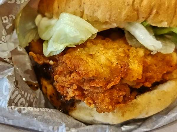 チキンフィレはバンズに匹敵するほどの厚みがあり、こぼれ落ちそうなほどボリューミー。今回は「ガーリックペッパーチキンフィレバーガー」を単品で購入したのですが、単品でも十分満腹になりそうです。
