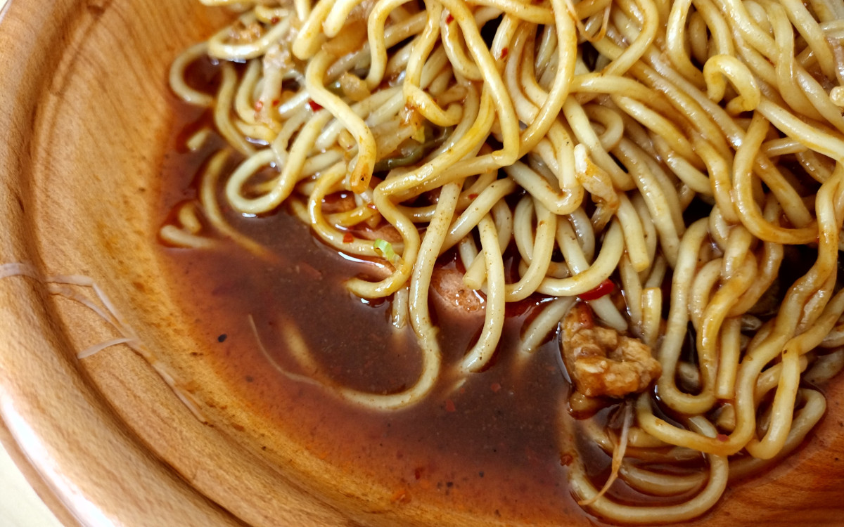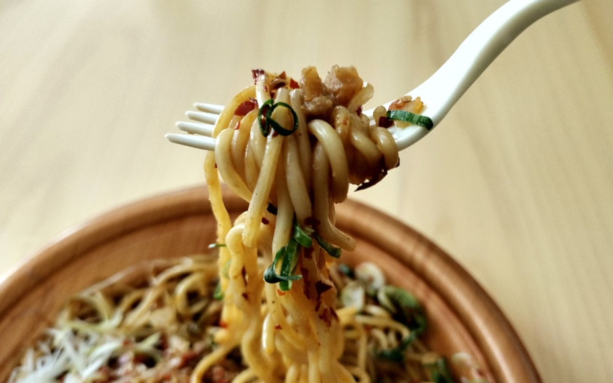 さっそくレンジで加熱調理(500Wで3分)して蓋をあけると、食べる前から辛さを感じるほどに香辛料の香りが広がります。底に少しとろみのあるスープが溜まっているので、しっかりと混ぜ合わせましょう。中太で柔らかめの麺は少し辛味のある焼きそば風。とろみスープもしっかりと絡まりました。