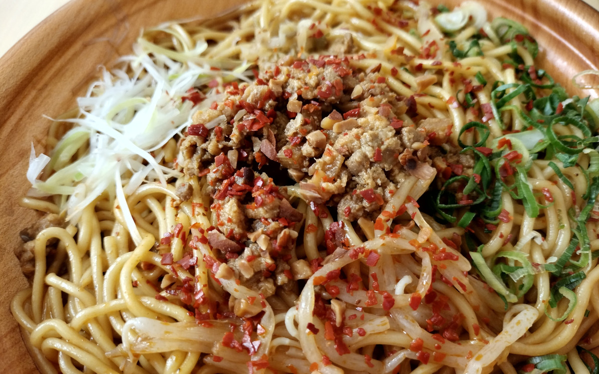 まずは具材をチェック。全体に赤唐辛子がかかっており、真ん中には肉そぼろ、その両側に青ネギと白髪ねぎが添えられていました。彩りがとても綺麗で食べる前からワクワクが止まりません。