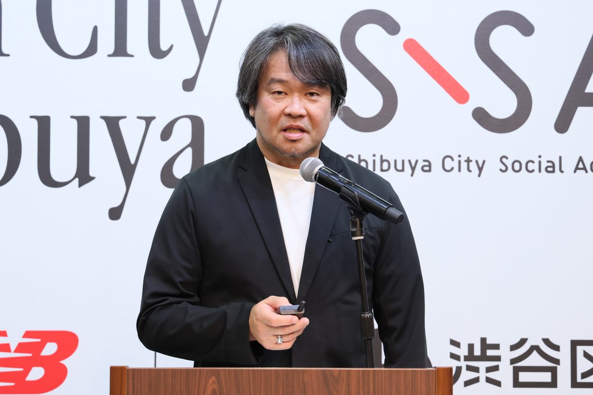 続いて渋谷区長の長谷部 健氏がスーツ姿に足元はニューバランスのランニングシューズという姿で登壇しました。