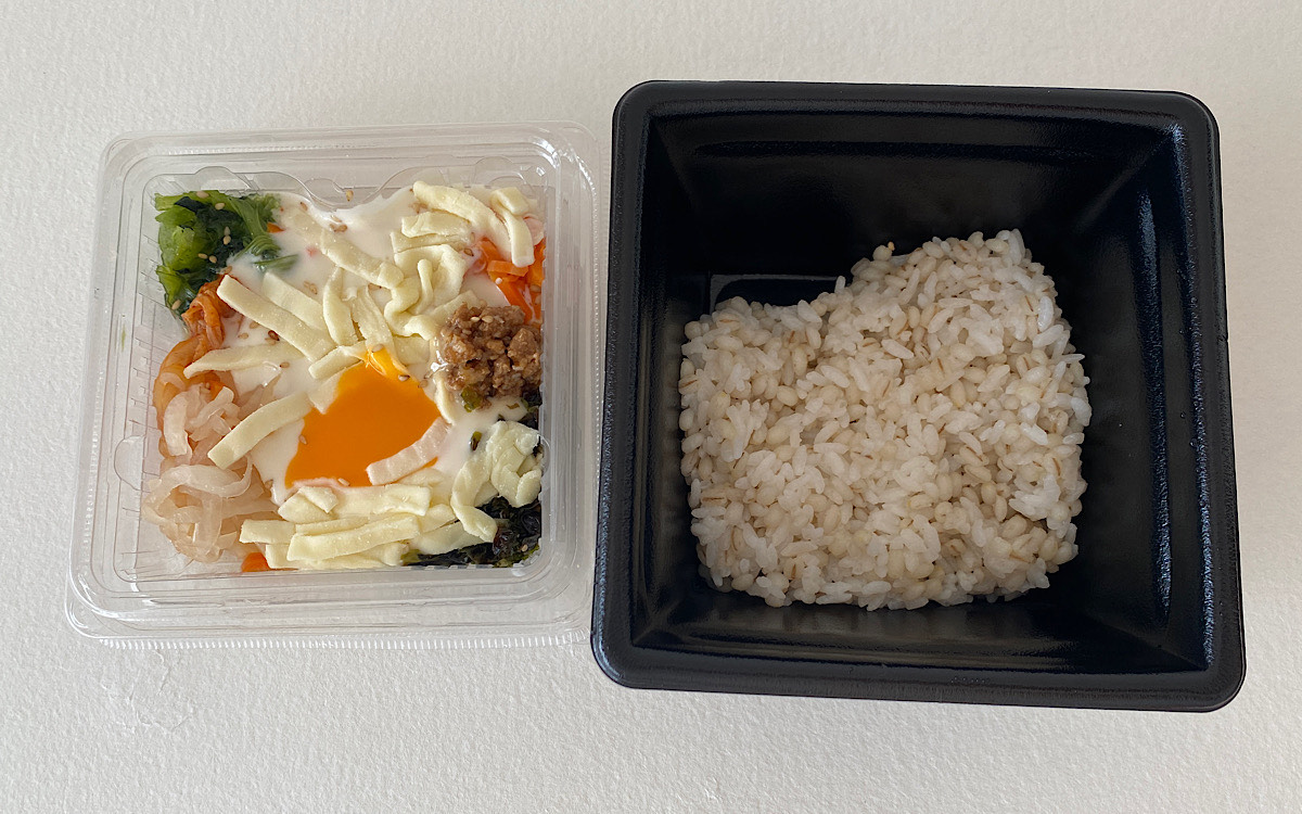 豚挽き肉は甘めの味付けで、大根のナムルやもやしはシャキシャキ。ご飯はもち麦入りで、プチプチとした食感もたまりません。全体を混ぜることにより、辛味、塩味、甘味のバランスがちょうど良くなりました。