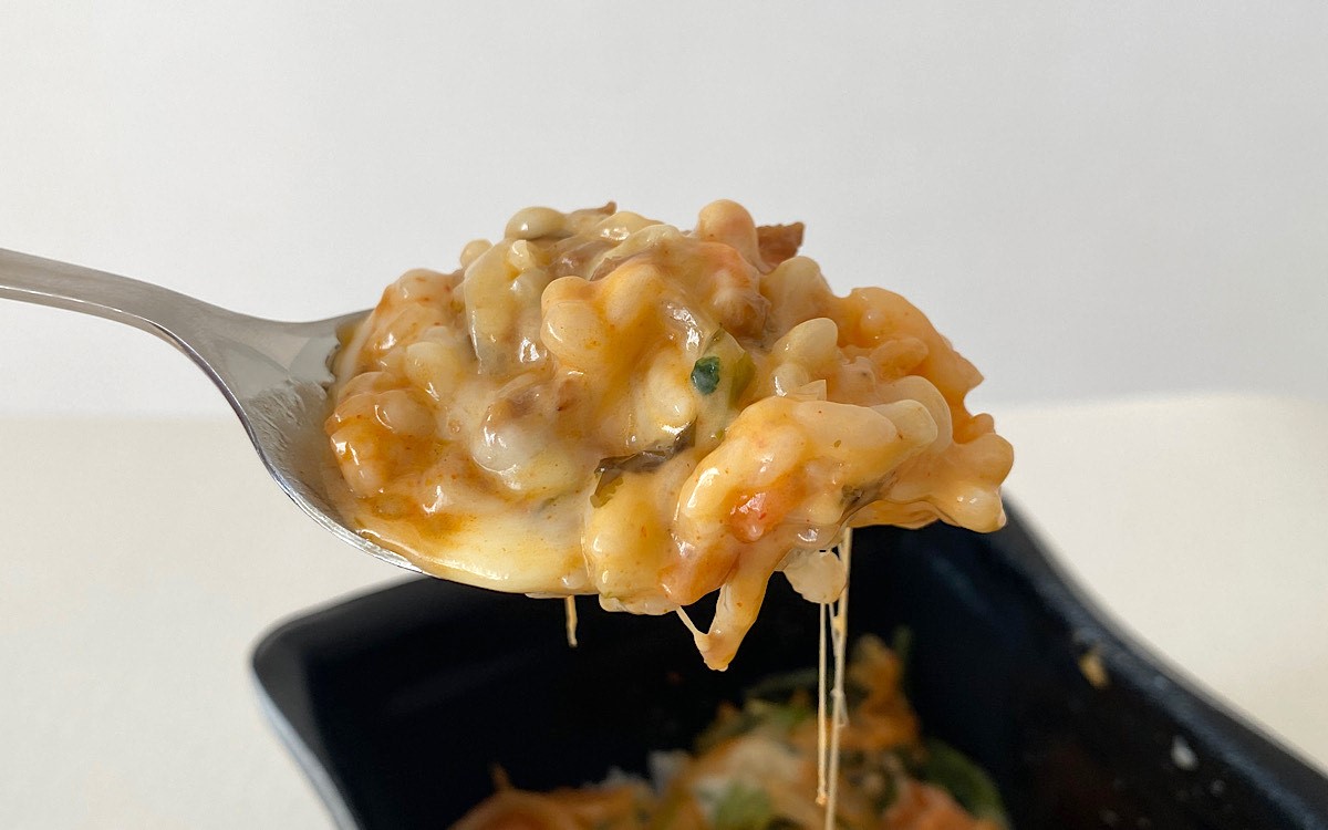 ご飯をスプーンですくってみたところ、商品名のとおりにチーズが「とろ~り」と伸びて食欲がそそられます。口にするとさっそく白菜キムチやコチュジャンの辛さをピリっと感じました。本格的な辛さに一瞬焦りを覚えましたが、すぐにチーズや卵黄ソースの濃厚なクリーミーさが口の中に広がり、辛さを中和してくれます。
