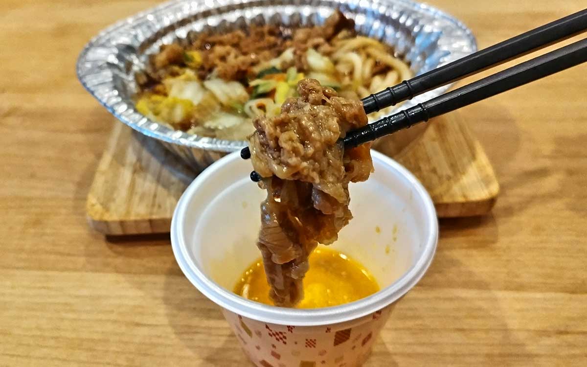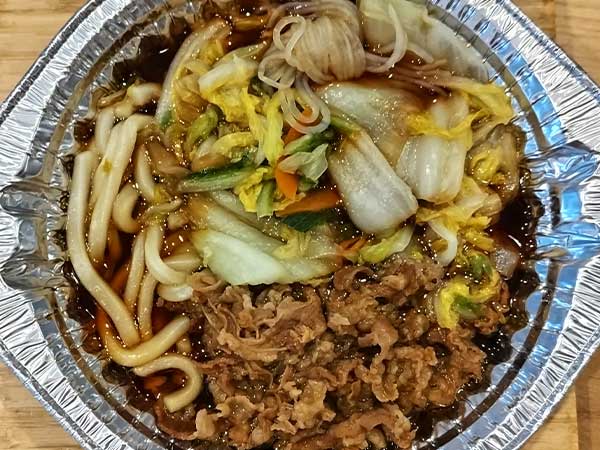 さっそく、たっぷりあるお肉から一口。お肉は柔らかいだけでなく、甘辛い割り下との相性も抜群で、口の中いっぱいにご飯をかきこみたくなる美味しさです。次に狙いを定めたのは、たっぷりある野菜たち。野菜が鍋の中で煮込まれ、旨みを吸収することで想像以上に深みのある味わいが口の中を覆い尽くしました。うどんやしらたきも、割り下の旨みがよくしみ込んでいてGOOD。これは、お箸が止まりません。
