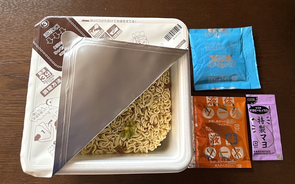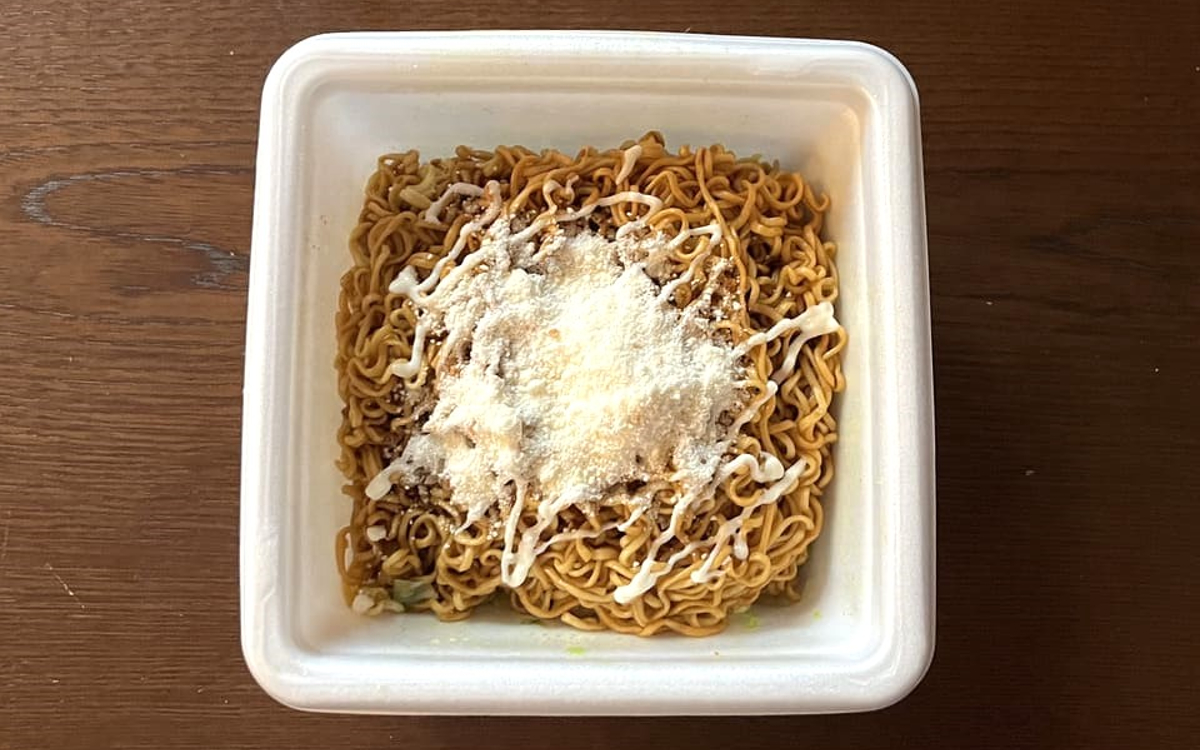 調理中、ソースを麺に絡めている段階ですでに食欲をそそるカレーの香りが広がりました。粉チーズを思わせるような付属のチーズ入りふりかけをたっぷりかけると、かなり衝撃的なビジュアルに。チーズ風味の特製マヨネーズとも相まって、茶色い麺と白色のコントラストが目を引きます。