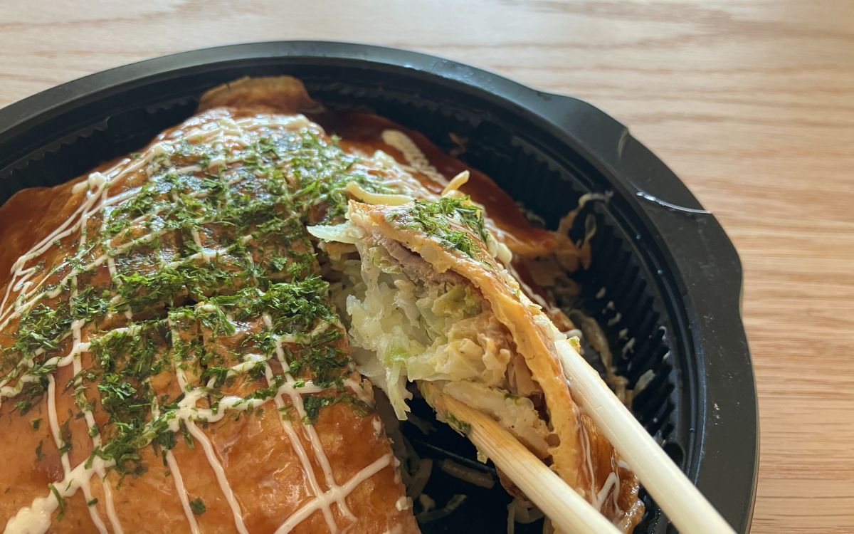 口に入れた瞬間、濃厚ソースの風味が口いっぱいに広がりました。キャベツの甘みと豚肉の旨味、卵のまろやかさが濃厚ソースとよくからんで、ずっと噛みしめていたくなる美味しさです。