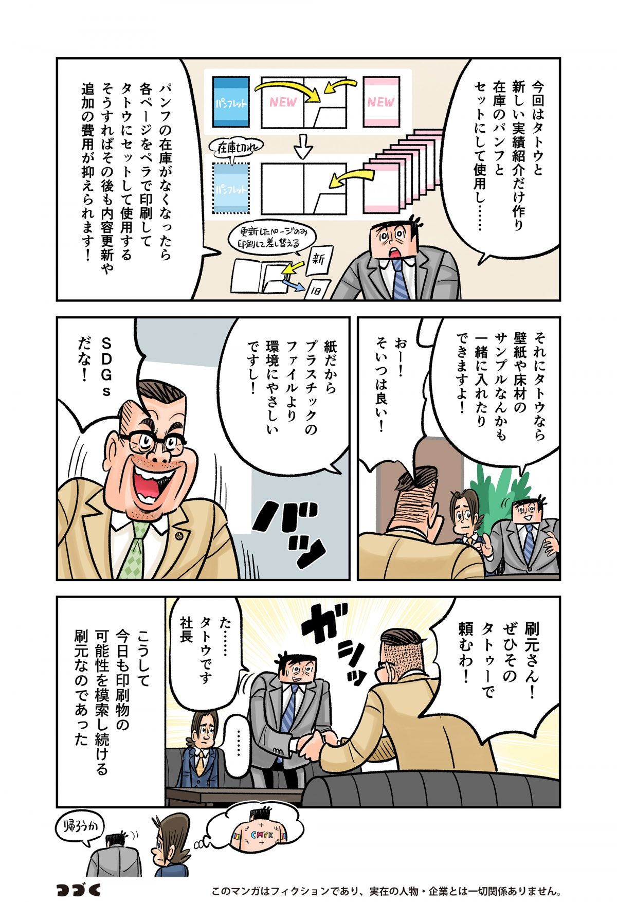 前回はパンフレットの更新版にタトウの技術を提案したナビ印刷。そんなナビ印刷は沖田担当でカレンダー制作が進んでいた……。