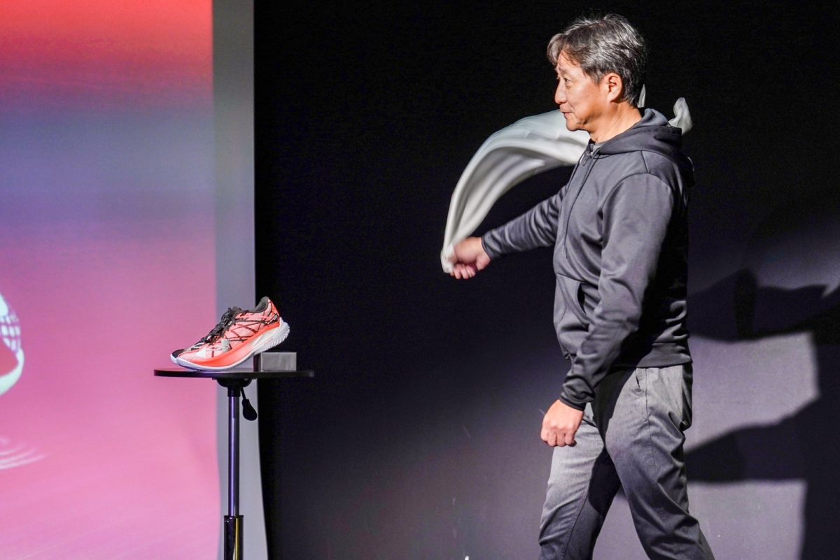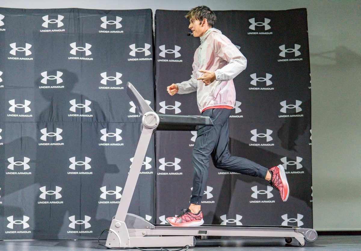 発表会では、昨年11月のつくばマラソンでサブ3を達成されたばかりのハリー杉山さんが登壇。1km3分45秒〜3分30秒でUAベロシティ エリート2の走り心地を体感され、「圧倒的爆発力がある」とその反発力に驚かれていました。