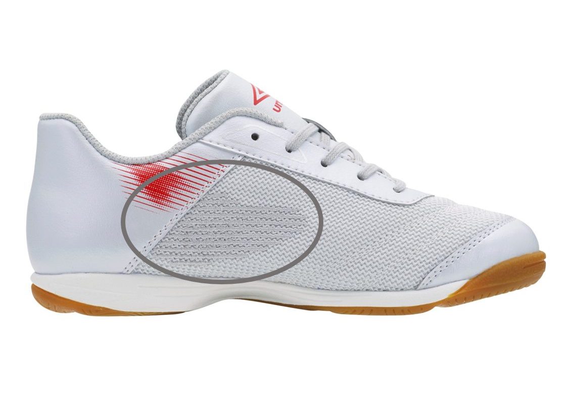 サッカーシューズは、ボールを蹴ることに加え、他の選手に踏まれたり、スライディングによる摩擦などにも対応するため、耐久性が非常に重要です。そのため、ソール、アッパーとも丈夫につくられており、どうしても足入れ感が硬くなり、筋力の弱い子どもの足では屈曲しづらく裸足の感覚と乖離が生じます。とくにフットサルや室内でのサッカー練習においては、ボールタッチの感覚やボールコントロール性を養うことが目的とされることが多いこと、また室内という環境要因から屋外ほどの耐久性が求められないことも踏まえ、アンブロは「“室内”で“子ども”が履くこと」を前提に新たな室内サッカーシューズを開発。