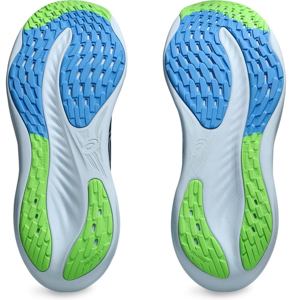 靴底は、独自開発のラバー素材2種類を配した「ハイブリッドアシック スグリップ」を採用し、グリップ力と耐久性を両立させています。中部に、さまざまな路面コンディションでも優れたグリップ力を発揮する「アシックスグリップ」を使用し、着地や蹴り出し時に力のかかりやすいつま先部とかかと部にはアシックス従来ラバーと比較し、約3倍の耐摩耗性をもつ「エーハープラス」を採用しています。