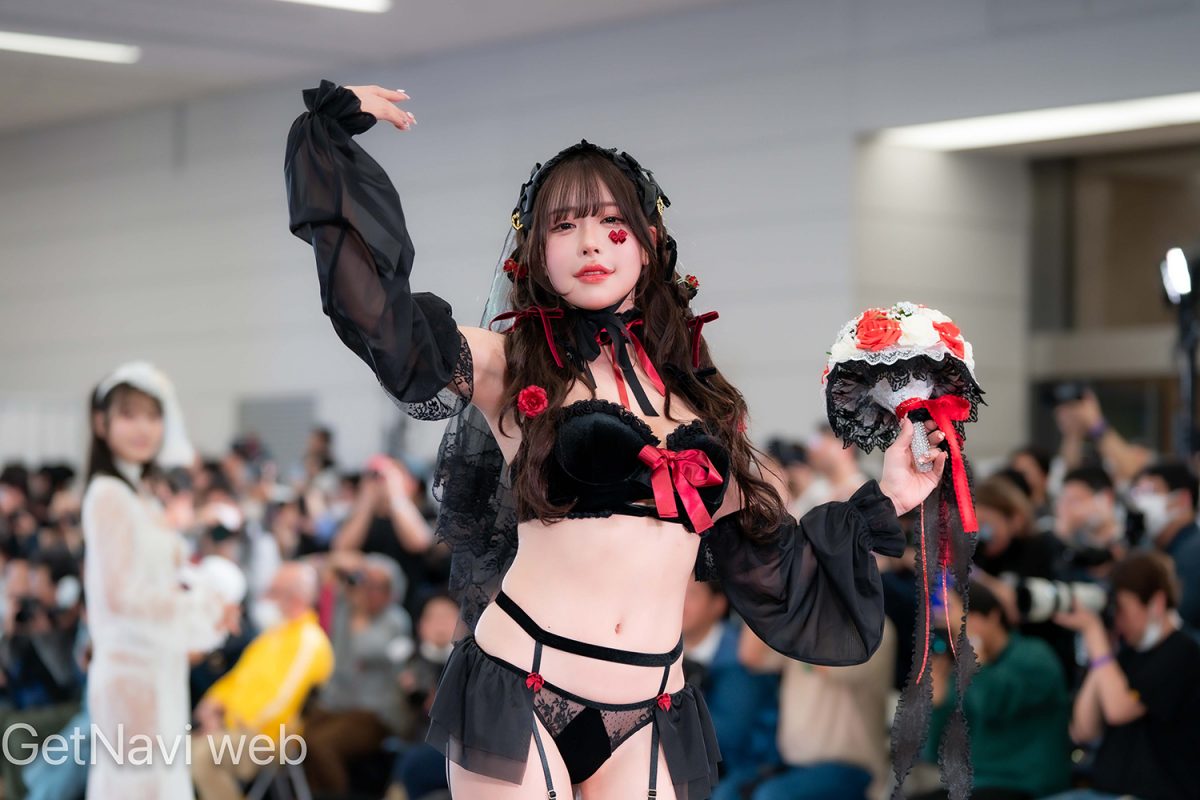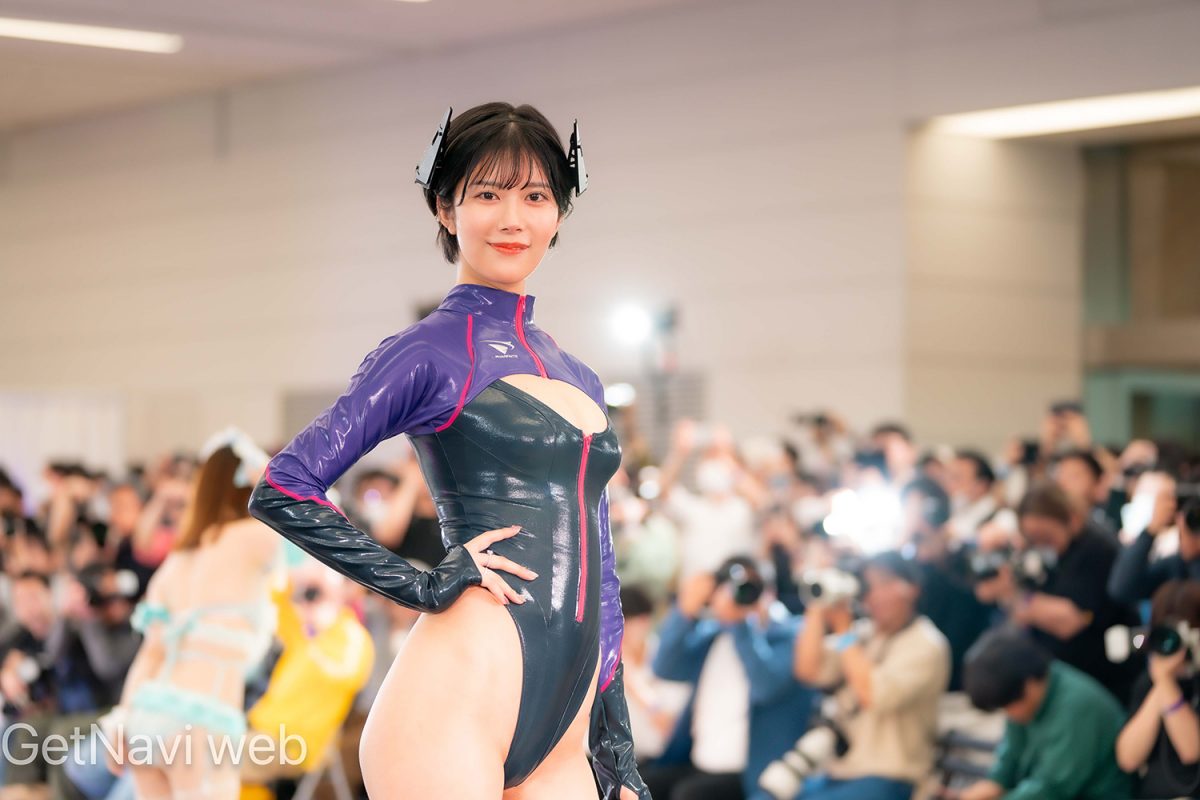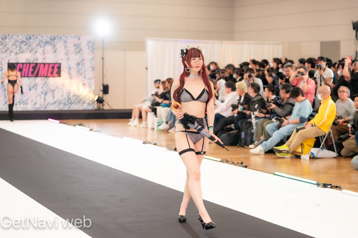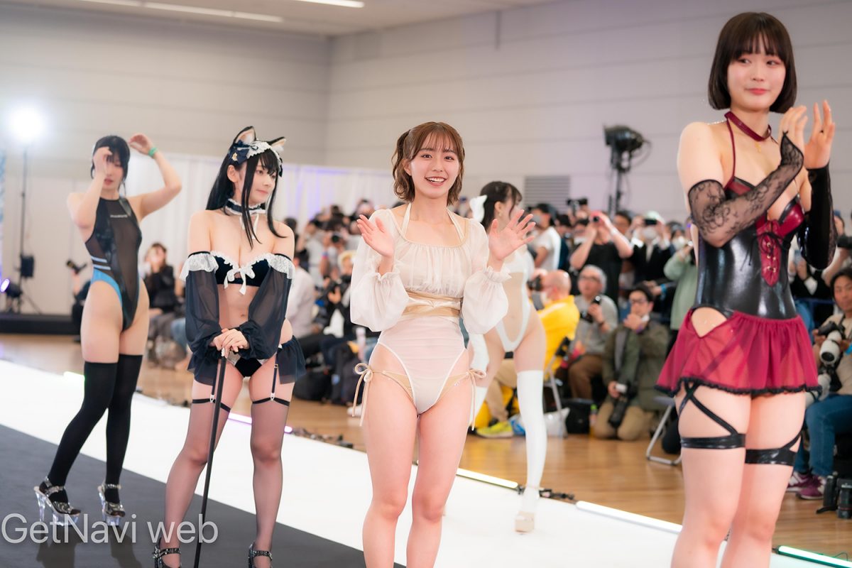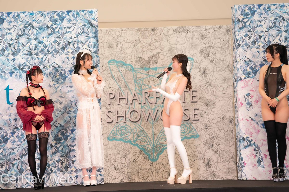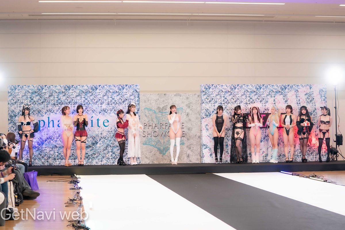 2部の後半には、本イベントの目玉ともいえる全長20mを超える特設ステージにて「PHARFAITEファッションショー」が行われた。ファッションショーの前半は、「JUWELBOX」と題してPHARFAITE着用モデルがそれぞれにオリジナリティあふれるコーディネートを披露。後半は「SHOWCASE」と題して、これまでに発売された人気のコスチュームから最新作のコスチュームまで、PHARFAITEのコンセプトが存分に味わえるファッションショーが展開された。ランジェリータイプや競泳水着タイプなど、セクシーなコスチュームを着こなした出演者約100名がランウェイを歩く姿は圧巻! ステージ両側に設けられた客席は、カメラを持ったファンで埋め尽くされていた。