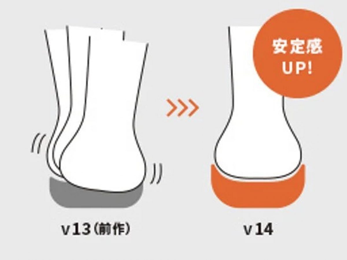 接地時の踵からの重心移動に注目し、「v13」に比べて重心が中心に集まる設計にデザインを一新しました。優れた屈曲性はそのままに、蹴り出し時にもっとも負担のかかる前足部のラバー形状を改良、接地面積も増大させ、よりスムーズに着地しやすい構造にアップデート。踵部外側には「N durance」を搭載し耐久性も考慮しています。