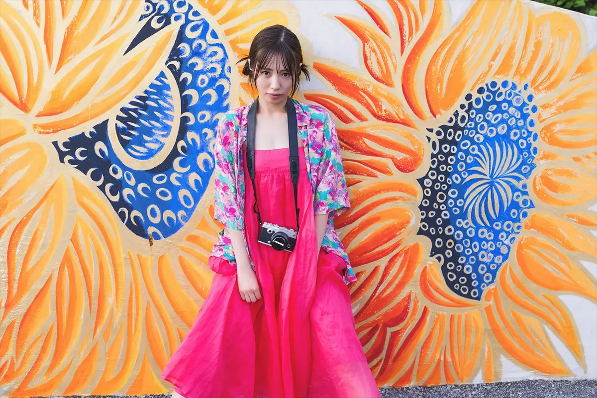 先行イメージカットは、ロケ地となった宮古島をイメージした南国を感じるピンクのワンピース、ハイビスカス柄の上着を着たカットで、アーティスティクなひまわりの壁画の前で撮られた1枚。首から大好きなカメラをぶら下げながら、少し照れくさそうな表情を浮かべてレンズを見つめている。