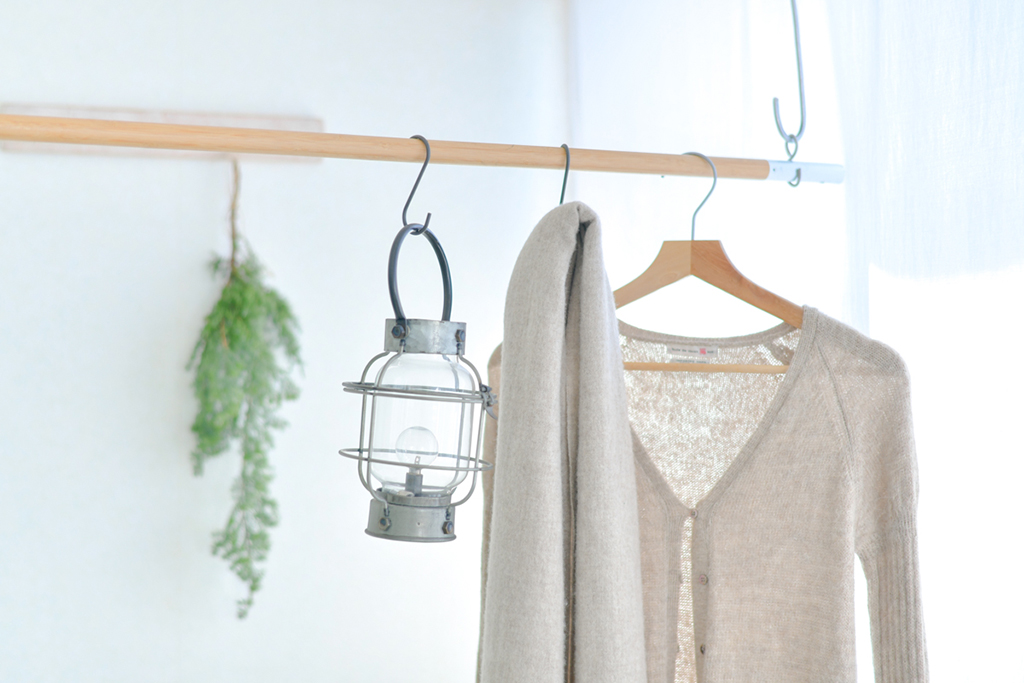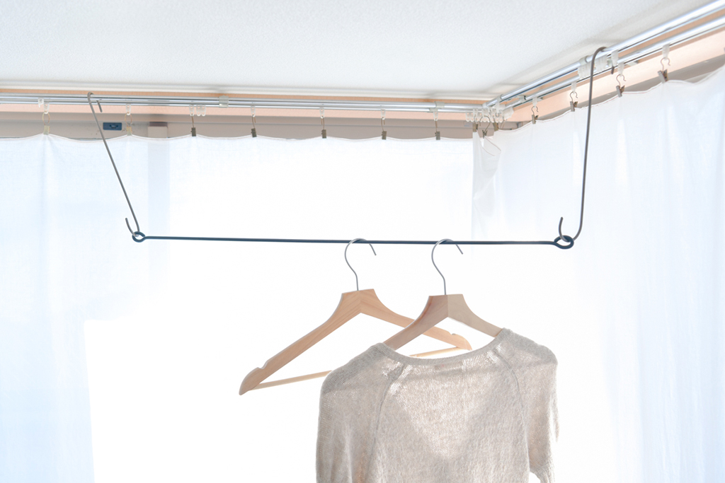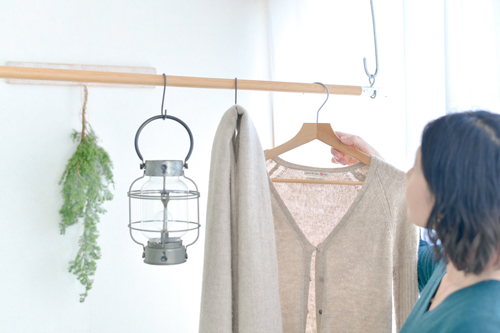「ニットはハンガーにかけて一時保管。また汗を蒸発させるために、風通しのよい場所にかけましょう。私はインナーバルコニーに干しています。写真のように、S 字フックを使って簡易なハンガーバーを作るのがおすすめです」