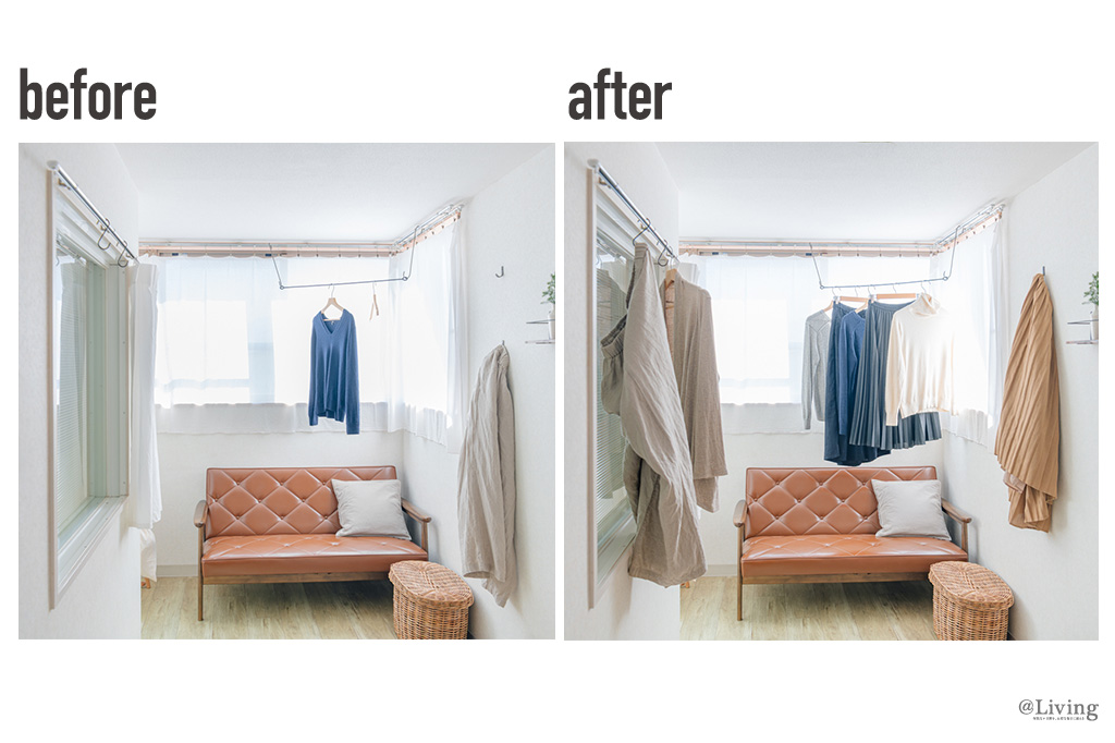 たとえば脱衣所に突っ張り棒を設置し、そこだけを一時保管の場所にしている場合、服が日を追うごとに積み重なり、着たいときにはシワシワ。最終的にはヨレっとしてしまい、結局洗濯機へ……。さらに、空間に余裕がないため、湿気がこもりやすくなります。見た目のだらしなさも気になりますよね。