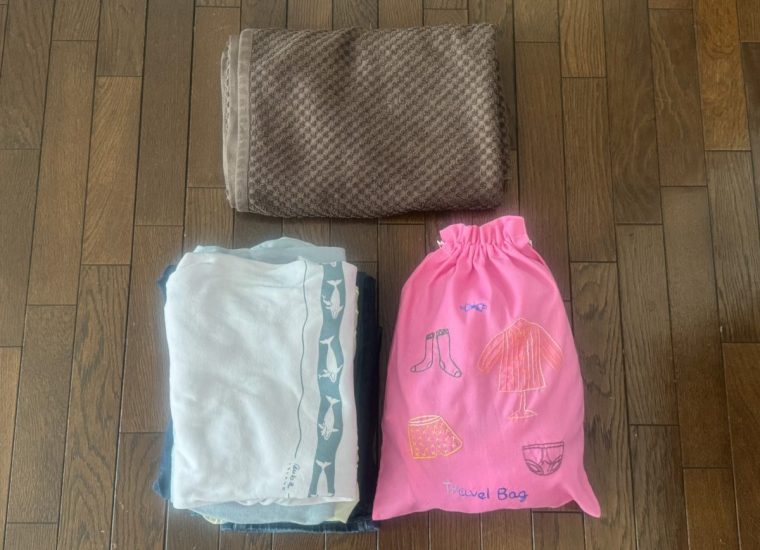 1泊2日に必要な最低限の荷物だけを集めてみました。バスタオルは意外とスペースをとりますので、宿先に常備されている場合は家に置いていきます。