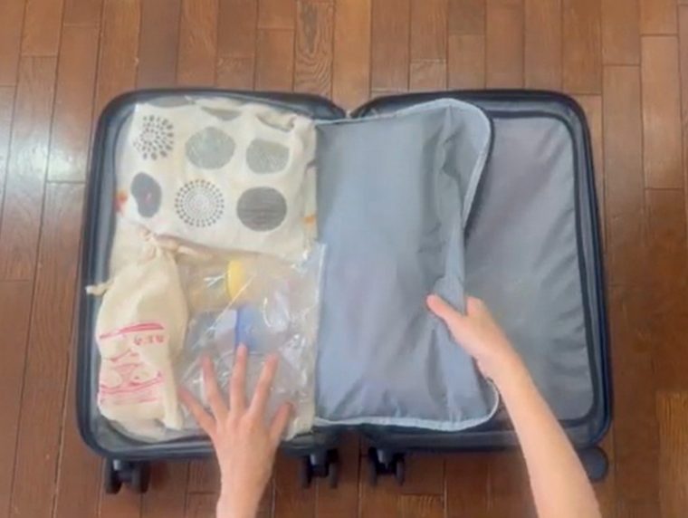 それでは、ベビー用品を左側に、大人のお泊りセットを右側に収納していきます。