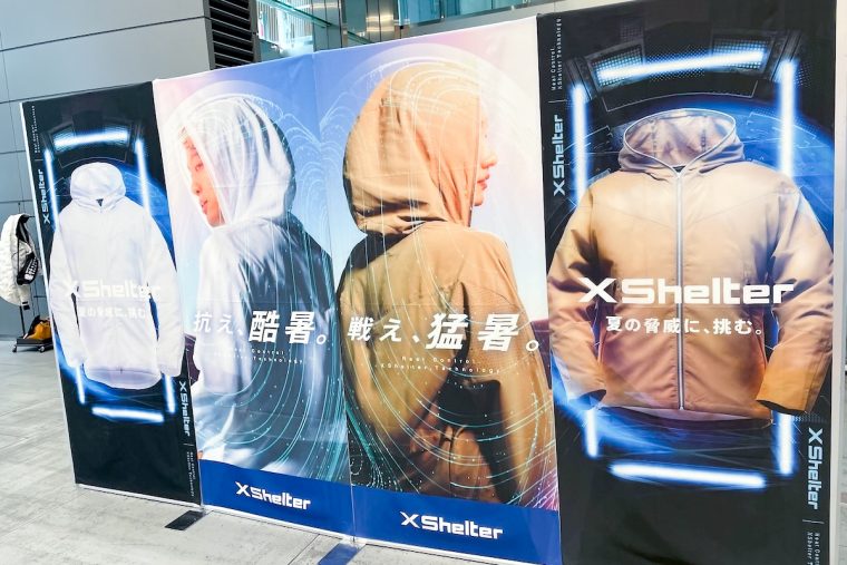 会場に設置された「気温45℃体験ルーム」に入ってみると、通常のアウターではじりじりと熱気が伝わるのに対し、XShelterを着用しているとその感覚が明らかに抑えられているのが分かります。