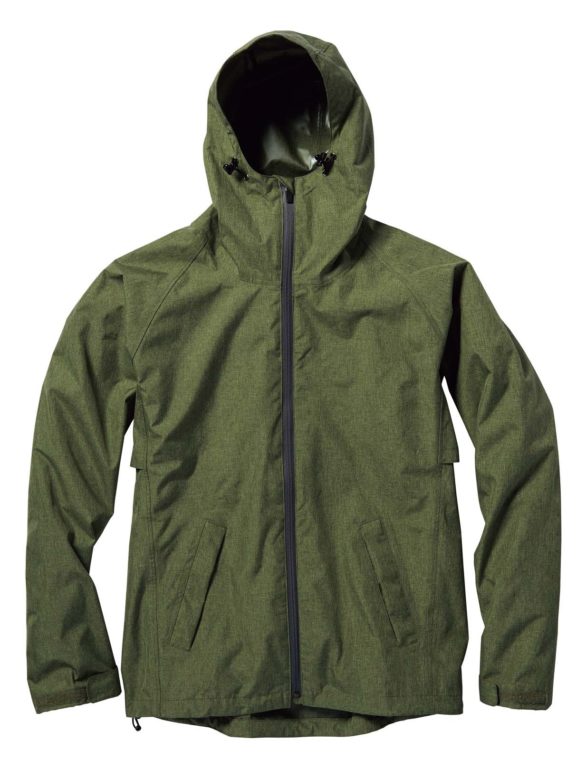 耐摩耗性と軽さ(約480g/Lサイズ)を重視した本格的なアウトドアスタイルのレインジャケット。細身のシルエットが特徴です。防水性能は大雨にも耐えられる耐水圧10000mm。収納袋が付属し、コンパクトに持ち運べます。