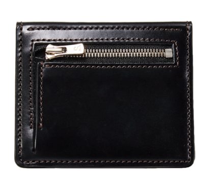 カードと紙幣が同時に視界に入り、直感的に使えるのがメリット。外側背面に付いたコイン室は片マチ仕様にすることで、膨らみの少ないフラットなシルエットを実現ました。素材はベルギー牛革を使用。紙幣は1万円札を10枚程度収納可能で、カードホルダーの裏側にスライドインして挟み込む収納構造です。●サイズ:W103×H90㎜×D15㎜
