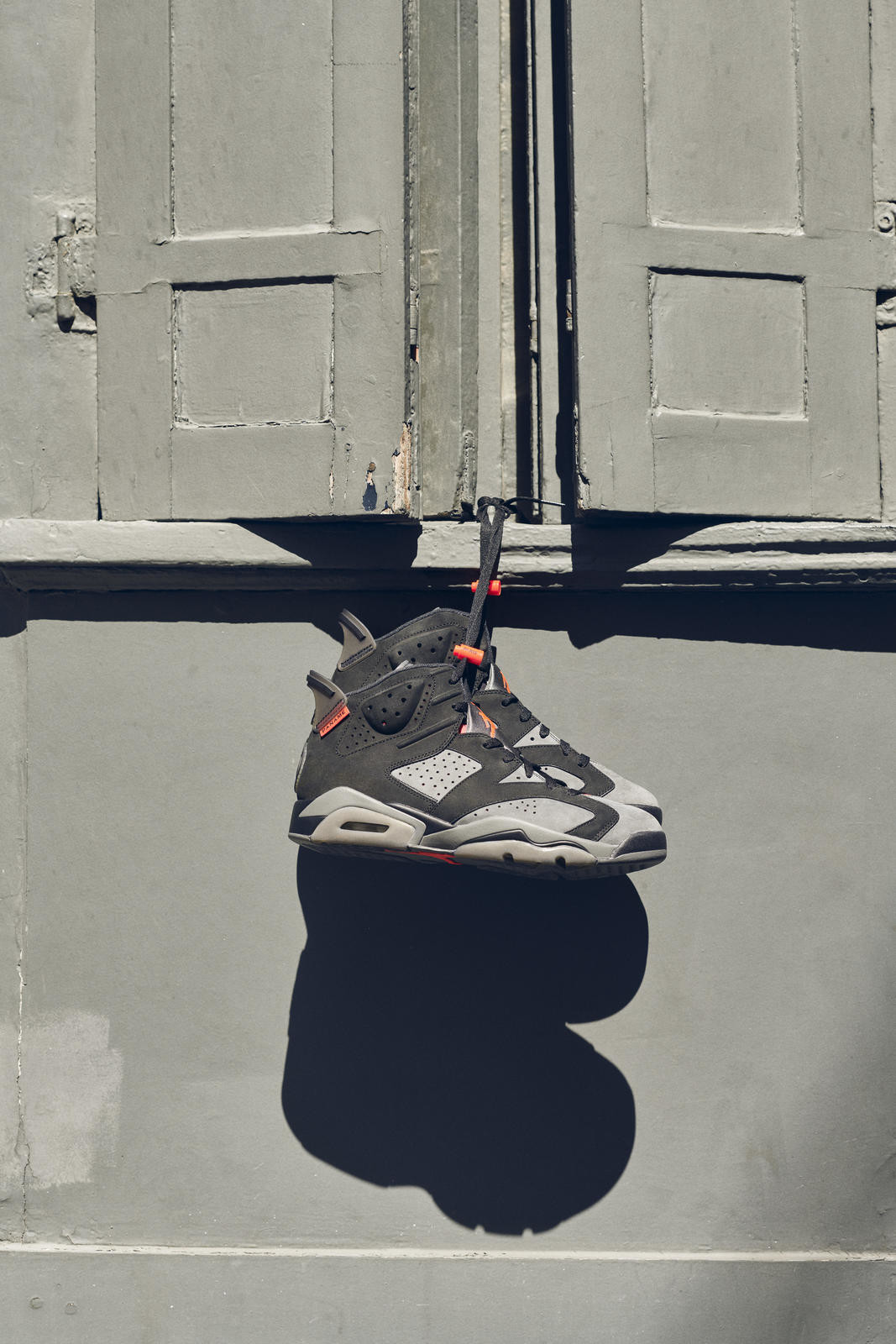 ジョーダン ブランド×パリ・サンジェルマンのコレクション第2弾では、アパレルに加え、3点のスニーカーも登場。「エア ジョーダン 6 レトロ PSG」は、ブラックをベースにグレーを組み合わせた、シックなカラーリング。パリの愛称“PANAME”の文字が入ったタグなど、インフラレッドカラーをアクセントとして取り入れています。ヒールには、コラボレーションを象徴するオリジナルのロゴを施しています。