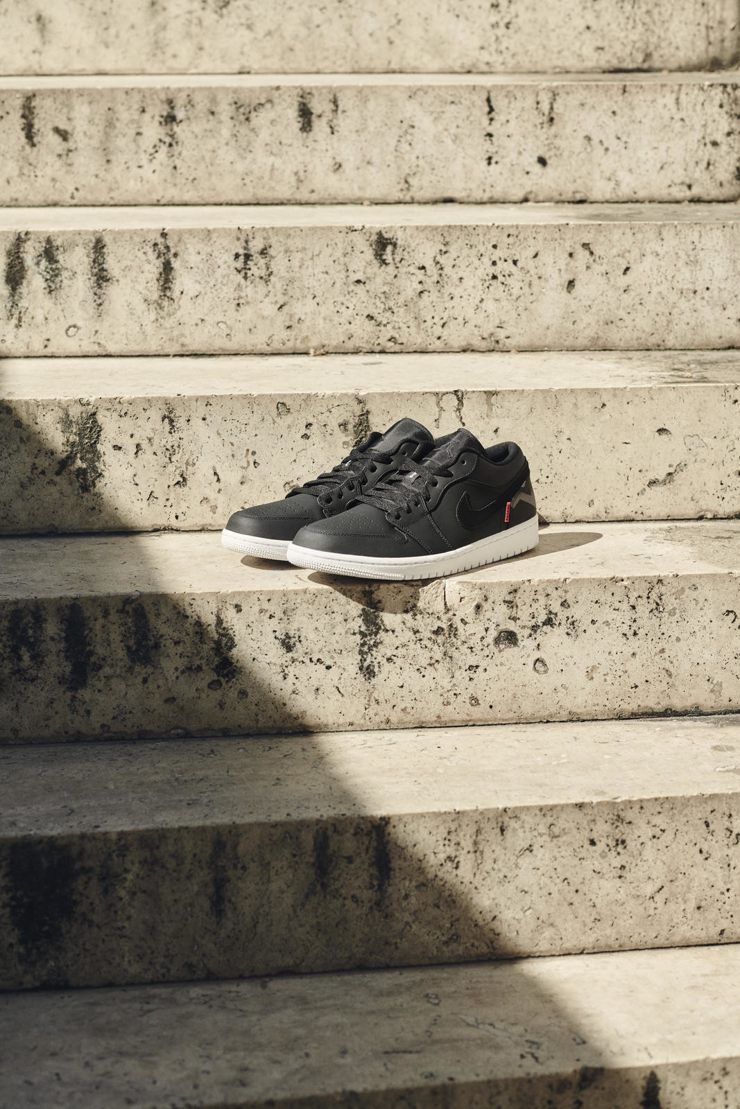 「エア ジョーダン 1 LOW PSG」はエアジョーダン1のローカットをベースに、シンプルなブラックで全体をカラーリング。サイドのスウッシュ下にはインフレレッドのタグを取り付け、ヒールにはコラボの証としてPSGとジャンプマンを組み合わせたロゴを配置。