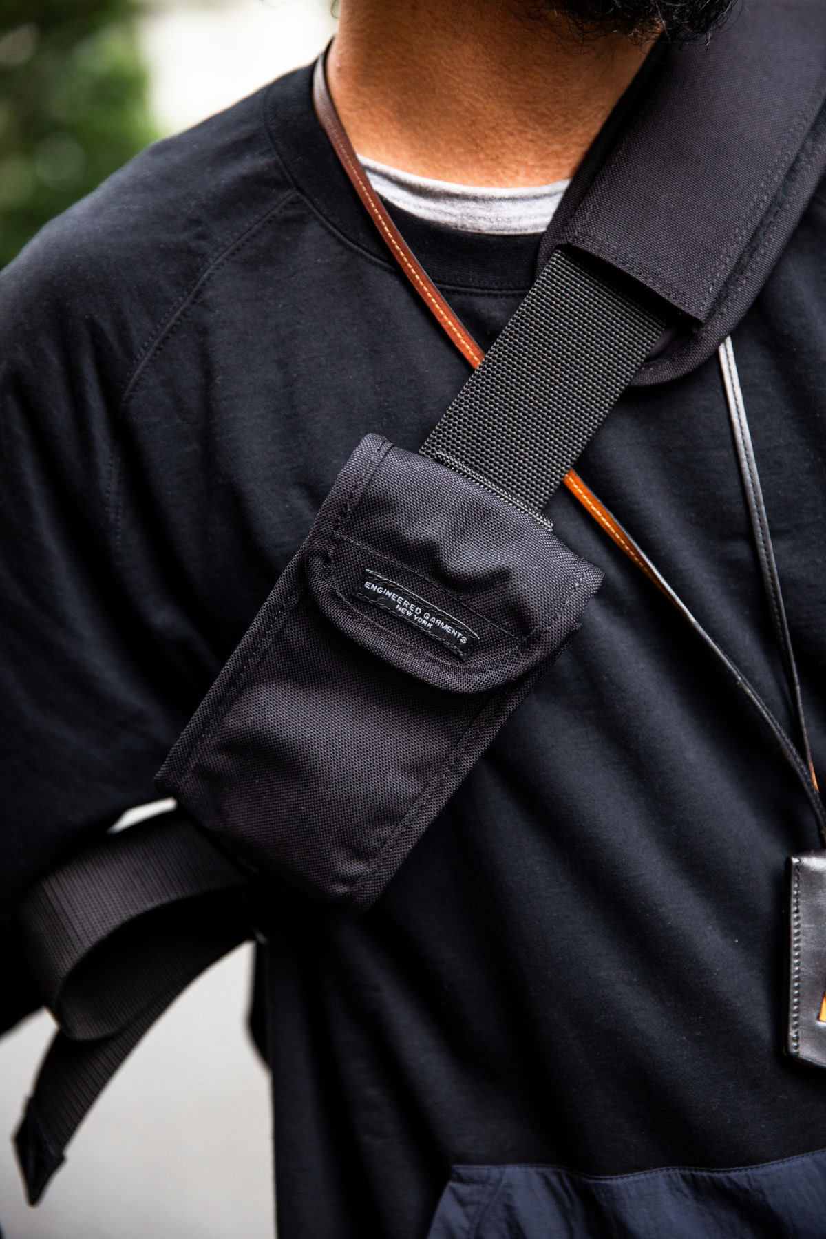 ENGINEERED GARMENTSが得意とする異素材使いのマルチパターンは、バッグの素材をいくつも組み合わせることで表現。通常は黄色のPVC裏地やクロームメッキのバックルなどもすべてブラックに統一しており、一見シンプルながらも、さりげなく個性の光るデザインへとアップデートしています。実用性とデザイン性を兼ね備えた、デイリーに使用できるアイテムです。