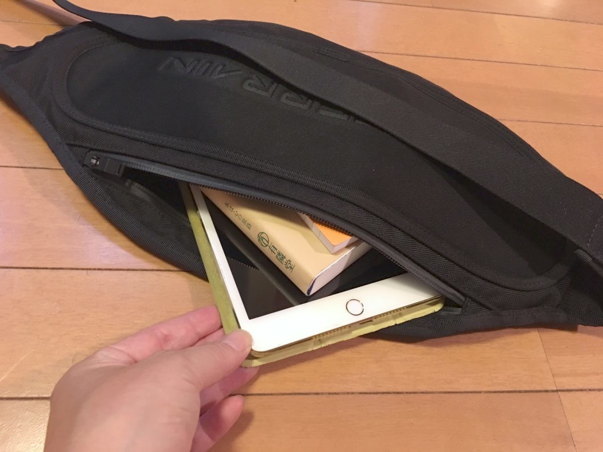 コンパクトですがサイズは縦24cm×横59cmなので、メインコンパートメントにはタブレットや書籍、メモ帳など街を散策するのに必要なグッズはラクラク収納できちゃいます。